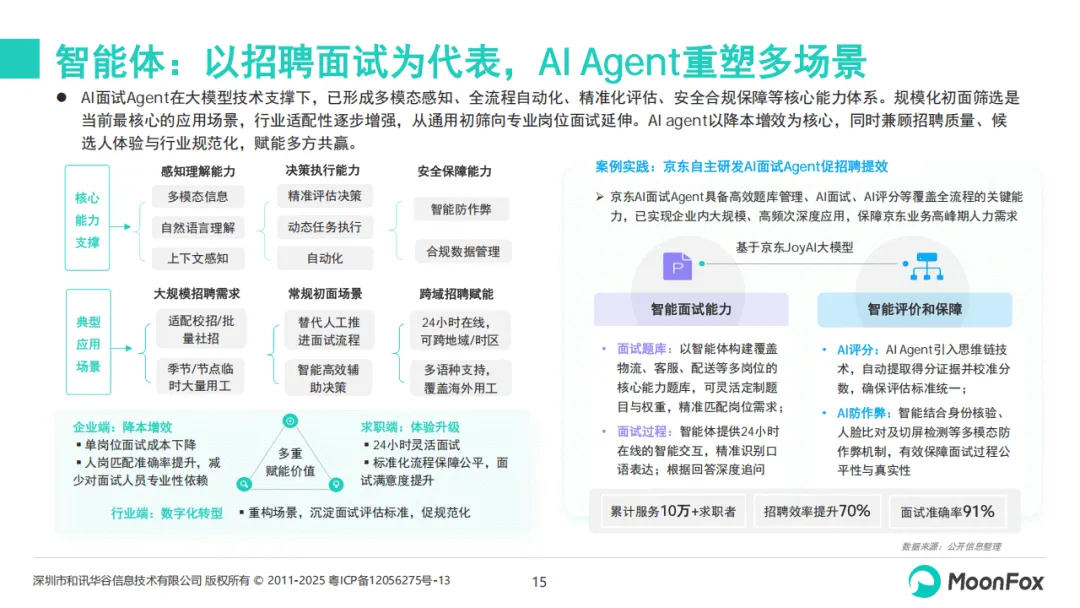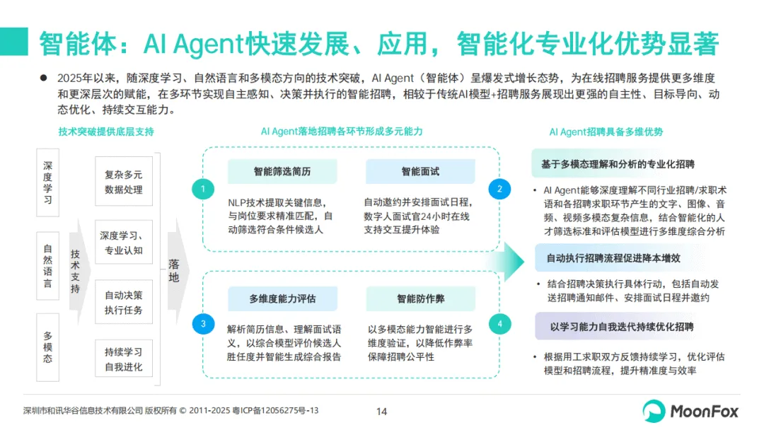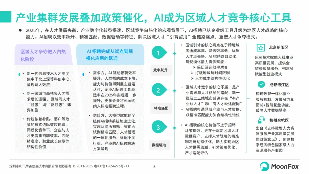 《2025年AI+招聘发展洞察报告》聚焦在线招聘行业AI化进程,剖析了2025年AI+招聘的发展现状、应用实践与未来趋势,指出AI已从企业级招聘工具升级为区域人才战略核心能力,成为驱动招聘行业变革的关键力量。