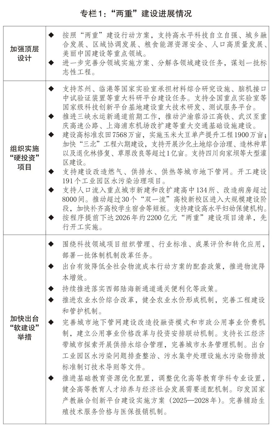 二是“两重”建设接续推进。强化“两重”性质、坚持自上而下、注重软硬结合,高质量推进国家重大战略和重点领域安全能力项目建设。加快“硬投资”项目实施,安排超长期特别国债8000亿元,支持1459个重大项目,督促加快开工建设,推动形成更多实物工作量。建立超长期贷款配套支持“两重”建设工作机制,加大项目融资支持力度。加力推进规划编制、政策制定、体制机制创新等“软建设”配套措施,完善项目投融资和价费、工程建设管理和运行管护等机制。