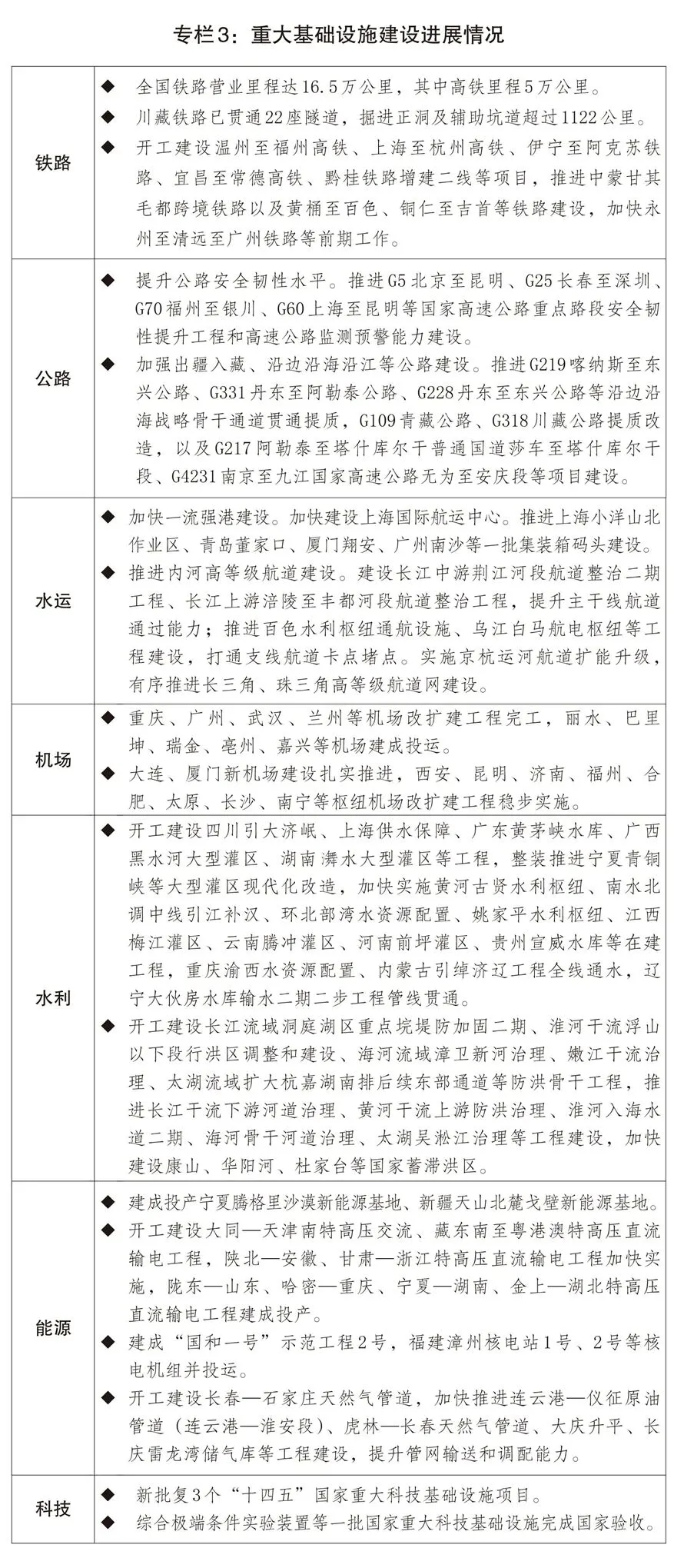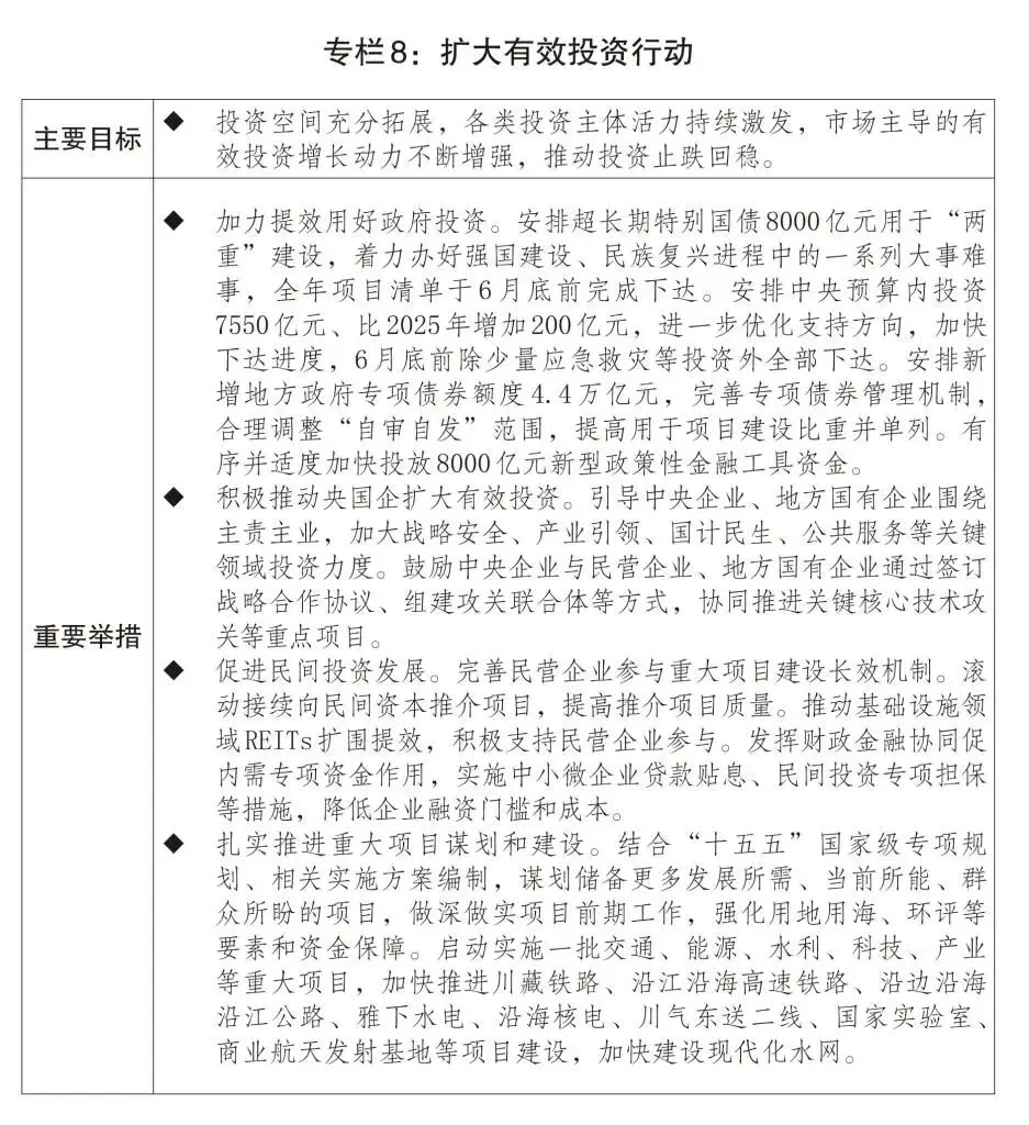 二是投资补短板调结构加力增效。统筹用好各类资金支持重点项目建设,持续优化中央预算内投资结构,扩大地方政府专项债券投向领域和用作资本金范围,指导专项债券“自审自发”地区扎实有序开展相关工作。推动“十四五”规划102项重大工程项目顺利实现规划目标任务,开工建设雅下水电等标志性工程。现代化基础设施体系建设深入推进,国家综合立体交通网“6轴7廊8通道”加速完善。规范和加强中央投资项目审批管理,提高政府投资效益。出台进一步促进民间投资发展政策措施。滚动向民间资本推介5400多个项目,涉及总投资超过3.9万亿元。加大基础设施竞争性领域向各类经营主体公平开放力度,5个新核准核电项目引入民间资本参股比例最高达20%,大渡河丹巴水电站等项目加快引入民间资本。推动基础设施领域不动产投资信托基金(REITs)扩围扩容,算力设施、城镇供热、农贸市场、城市更新、专业仓库等领域实现“首单”发行。2025年工业投资、制造业投资分别增长2.6%、0.6%。