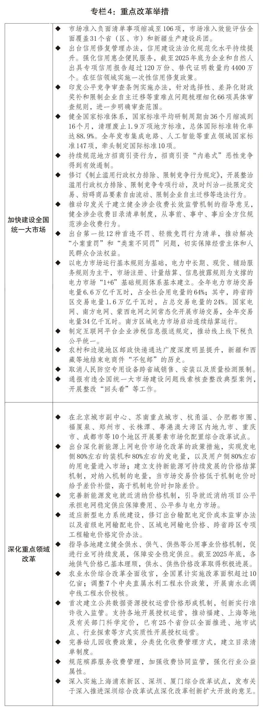 一是全国统一大市场建设向纵深推进。实施全国统一大市场建设指引,出台市场准入负面清单(2025年版),清单事项缩减至106项。深入开展市场准入壁垒清理整治行动,累计修订或废止相关文件2300余件。加快建设统一开放的交通运输市场,实施交通物流降本提质增效行动计划,市场设施联通更加高效顺畅。推动修订反不正当竞争法,出台公平竞争审查条例实施办法,开展整治滥用行政权力排除、限制竞争专项行动。持续规范地方招商引资行为,招商引资乱象得到有效遏制,地方制定实施政策的合规意识明显增强。出台健全社会信用体系的意见,构建信用修复制度,建立企业信用状况综合评价体系,全面推行以专项信用报告替代有无违法违规记录证明。全国统一电力市场体系初步建立,跨电网经营区常态化电力交易机制基本建立,电力现货市场基本覆盖全国。