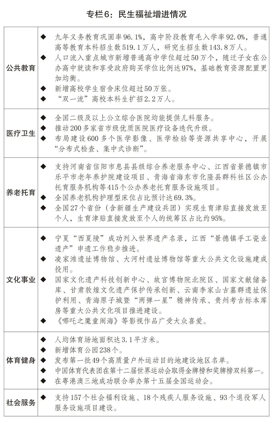 二是公共服务体系更加健全。国家基本公共服务项目基本实现城乡标准统一、制度并轨。逐步推行免费学前教育,2025年秋季学期起免除公办幼儿园学前一年在园儿童保育教育费,对民办园适龄儿童给予相应减免。建立同人口变化相协调的基本公共教育服务供给机制,以人口流入地为重点加强普通高中建设,支持“双一流”建设高校提质升级,扎实推进优质本科扩容,推动高校学科专业调整。实施医疗卫生强基工程,推进优质医疗资源向中西部等医疗资源薄弱地区有序输出、定向放大,推动医院病房改造和设备更新。加强公共卫生防控救治体系建设。积极推动中医药振兴发展。渐进式延迟法定退休年龄改革稳妥实施。促进普惠养老服务高质量发展,推进医养结合,提升养老服务机构护理能力。大力发展银发经济。以城市为单元整体推进普惠托育服务发展。全面实施育儿补贴制度,对3周岁以下婴幼儿每孩每年补贴3600元,并对补贴免征个人所得税。完善全民健身公共服务体系,建设高质量户外运动目的地,拓展全民健身空间场地。开展家政服务职业技能专项培训行动,促进家政服务业提质扩容。加强困境儿童福利保障工作,推进社会福利服务设施建设。健全退役军人保障服务体系。加大公益性殡葬设施支持力度。