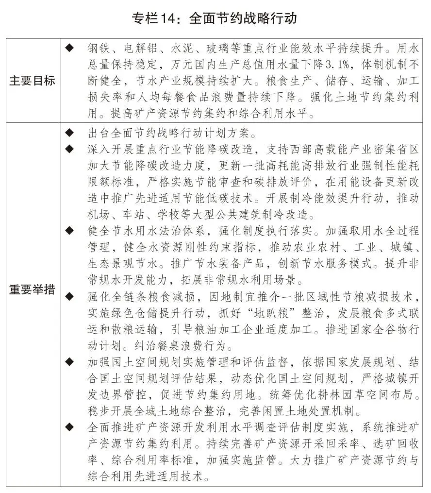 三是加快形成绿色生产生活方式。开展全面节约战略行动,持续推动“能水粮地矿材”一体化节约。推动修订节约能源法,修订重点用能和碳排放单位管理办法,开展制冷能效提升和绿色照明行动,推行公共机构能源费用托管等市场化节能模式。深化节水型社会建设,扩大非常规水利用规模,大力发展节水产业。大力开展粮食节约和反食品浪费行动。发展循环经济,提高垃圾分类和资源化利用水平,加快构建废弃物循环利用体系,加强再生材料推广使用。支持氧化铝提锂提镓。支持“以竹代塑”产业发展。设立国家低碳转型基金,培育氢能、绿色燃料等新增长点。健全绿色消费激励机制,推广绿色低碳生活方式。