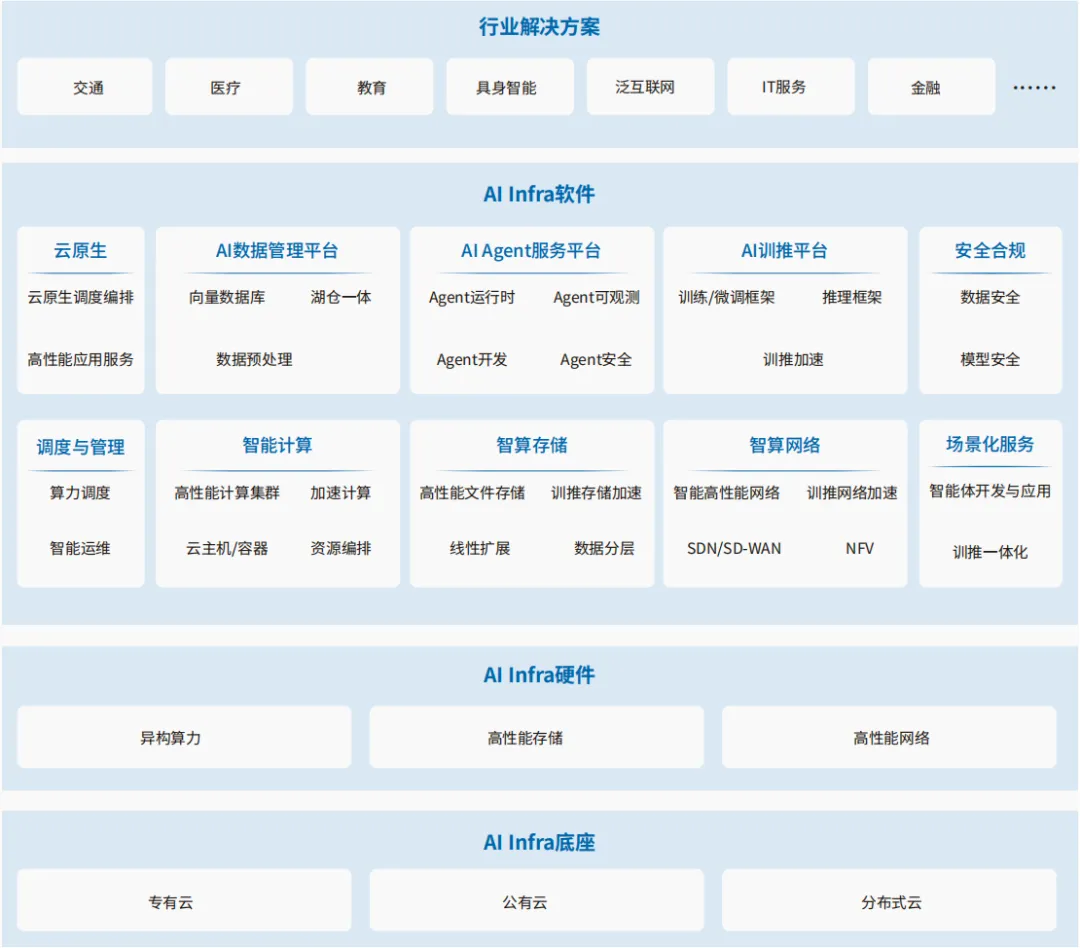 为有效支撑上述需求和趋势,AI Infra发展出完整的四层架构:基于分布式架构的AI Infra底座层、异构的AI Infra硬件层、高性能的AI Infra软件层,以及基于场景化服务能力形成的行业解决方案层。