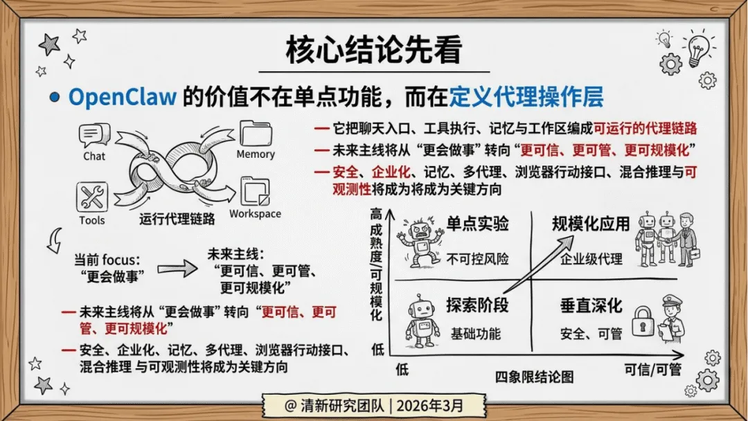 清华大学清新研究团队2026年3月发布的OpenClaw未来可能方向研究报告,指出OpenClaw的核心价值并非单点功能,而是定义了AI代理操作层,其发展主线将从“更会做事”转向“更可信、更可管、更可规模化”,安全、企业化、记忆等成为关键发展方向。