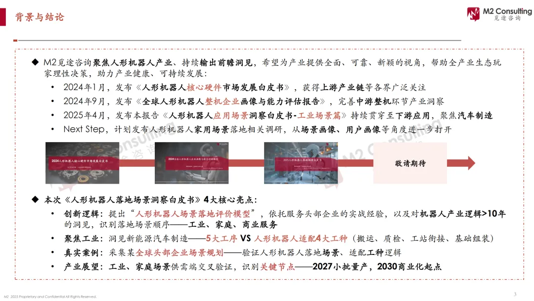 M2 觅途咨询 2025 年 4 月发布《人形机器人应用场景洞察白皮书 - 工业场景篇》,聚焦下游应用端的工业场景落地,以新能源汽车制造为核心分析人形机器人的产业落地逻辑、现状及未来关键节点。