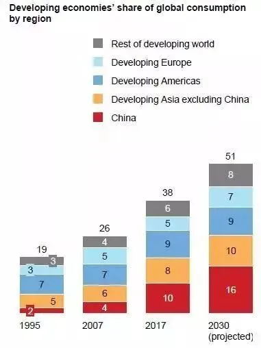 最后就是被单独放出来的“特殊发展中国家”:中国(红色)部分。中国从2017-2030年间,全球化产品的消费能力将从10%上升到16%。这也从侧面印证了,中国从1995-2007的全球工厂,转型成为2017-2030的全球市场。