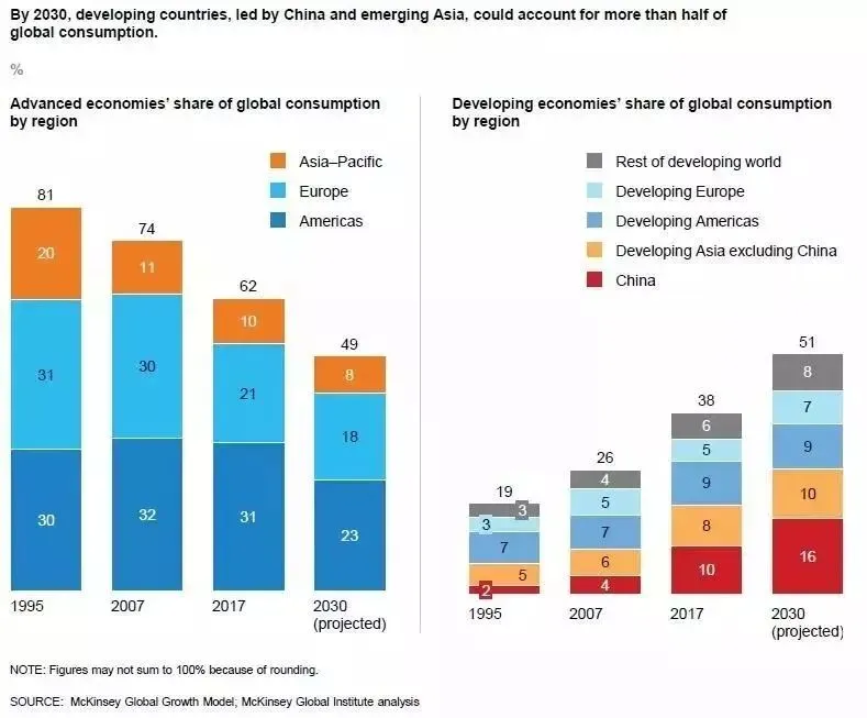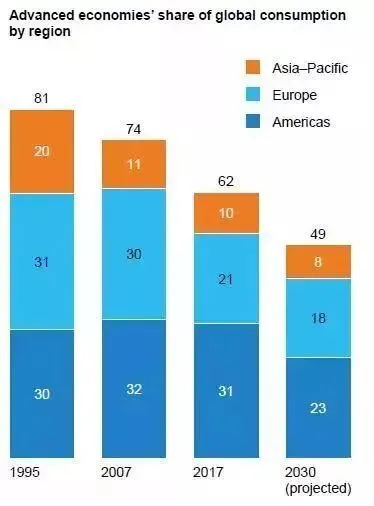 而等到2017-2030这个阶段,根据预估,发达国家消费全球化商品的规模,将从原先的81%,大幅降低到49%。其中美洲(图上深蓝色),就是美国和加拿大,其消费全球化产品的能力将从31%,降低到23%,代表着美国人的消费能力,将出现一定程度的下滑。