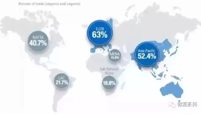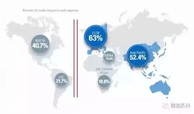 上图是全球各区域贸易联系,占世界总贸易量的比重: