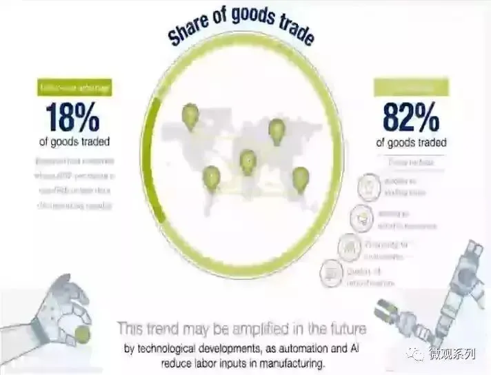 特别是劳动密集型制造业,其占据全球贸易的份额从2005年的55%,快速下滑到2017年的43%,并且在未来,这个下滑趋势只会越来越大,绝不会再增长了。究其原因,是因为自动化和人工智能的大力发展,让一些梦想着模仿中国模式,靠着中国式劳动力成本崛起的东南亚国家,美梦破碎。在工业4.0时代,在一条生产线上,你根本不需要那么多人。