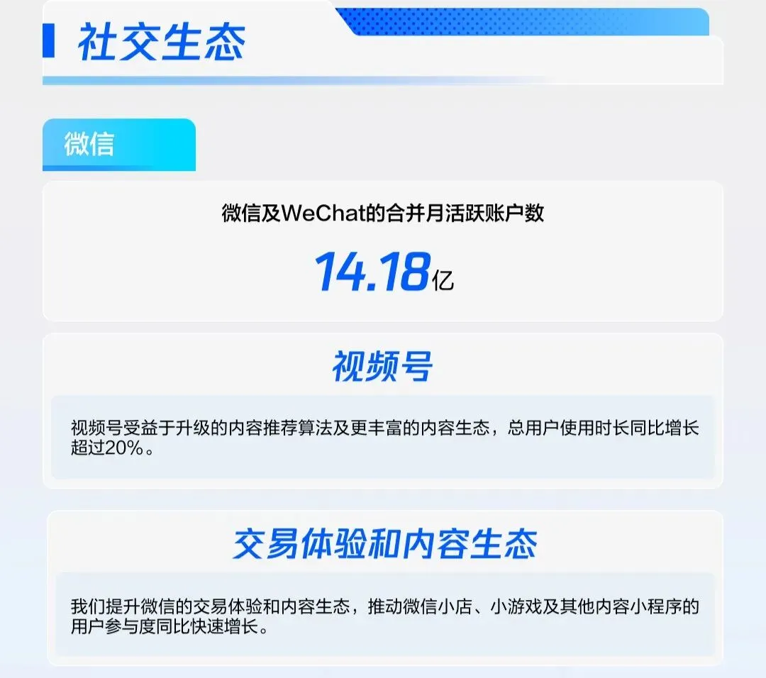很多人觉得微信用户已经饱和,但财报数据打破了这个误区。14.18亿月活,还在稳步增长,这是全网独一无二的超级流量池。更关键的是,视频号深度打通微信社交、搜一搜、小程序、朋友圈,你的一条视频,能触达好友、同城、垂直兴趣用户,甚至跨场景推荐。