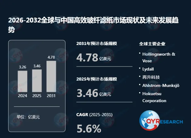 根据QYR(恒州博智)的统计及预测,2025年全球高效玻纤滤纸市场销售额达到了3.46亿美元,预计2031年将达到4.78亿美元,年复合增长率(CAGR)为5.6%(2025-2031)。