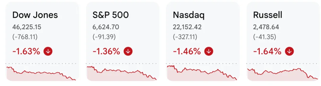 周三,多重利空因素叠加令美国三大股指全线重挫。 收盘时,标普500下跌1.36%,道指下跌1.63%,纳指下跌1.46%,罗素2000下跌1.64%。