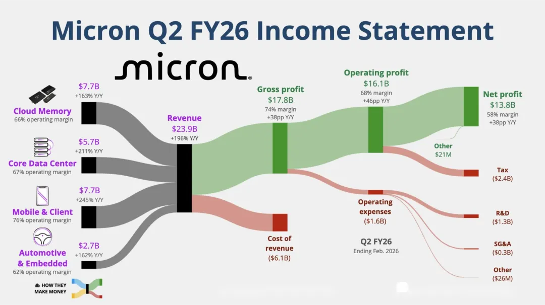 云存储业务收入77.5亿美元,核心数据中心业务收入56.9亿美元,两块加起来已经占到总营收一半以上。与此同时,移动、客户端、汽车和嵌入式业务也在同步走强。这说明美光现在不是只有单一业务爆发,而是整个产品线都在受益,只不过AI链条最强、弹性最大。