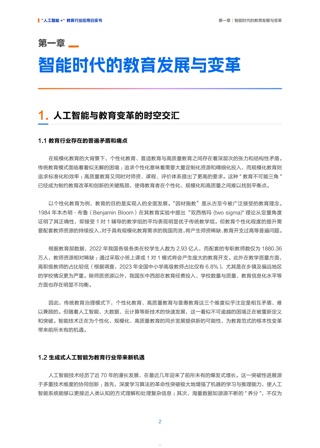 人工智能与教育的融合是一场知识传播与人才培育的革命,为教育行业带来了全新的发展机遇。目前 AI 在教育领域的应用已覆盖学生学习、教师教学、教育公平、评估监测等多个方面,未来将进一步推动教育生态向更加智能、个性、富有活力的方向发展,成为学习者和教育者的智慧伙伴,助力人类实现全面、深度的均衡发展。