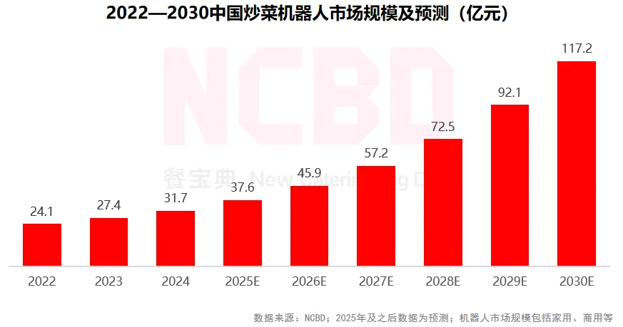近年来,中国炒菜机器人市场呈现出明显的增长态势。NCBD(餐宝典)数据显示,2024年中国炒菜机器人行业的市场规模已超过30亿元;预计到2030年,中国炒菜机器人市场规模将超过110亿元。