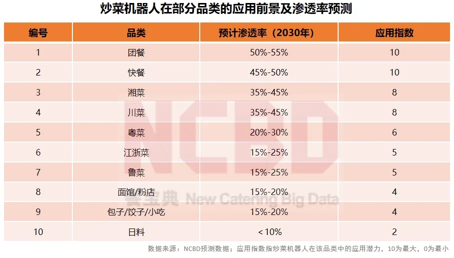 NCBD(餐宝典)研究认为,从未来的应用空间来看,炒菜机器人在团餐、快餐、湘菜以及川菜等领域有较大的发挥空间;而在日料等领域,炒菜机器人发挥空间相对有限。
