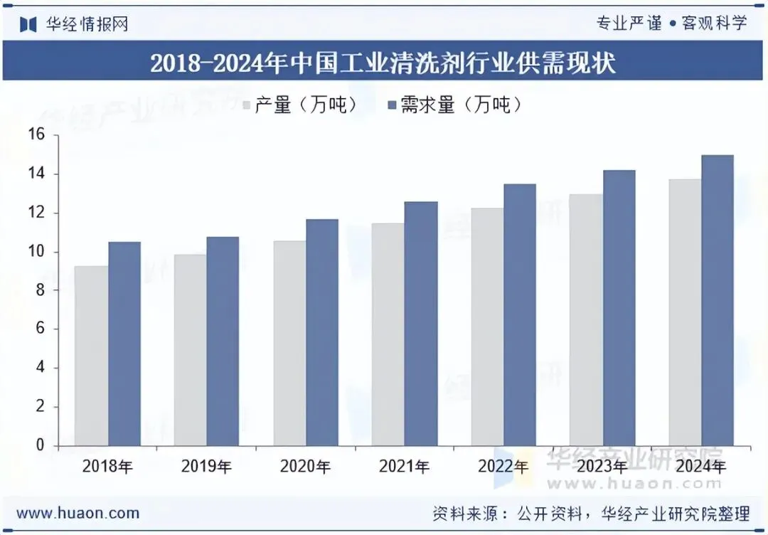 乙醇酸可以和设备中的钙、镁盐、锈等进行反应形成的乙醇酸钙、乙醇酸镁等复合物达到除垢的目的,可以对水井、砖石材料、印刷电路板、乳制品设备等进行清洗并且对设备的伤害较小,是一种高效、低成本的清洗剂。近年来我国工业清洗剂行业供需不断增长,截至2024年产量达到13.8万吨,需求量为15万吨,工业清洗剂需求的增长将带动乙醇酸行业需求的增长。