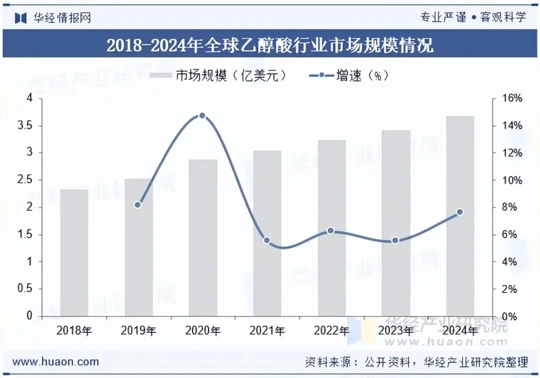 近年来,随着新工艺日益成熟,生产规模日益扩大,新的乙醇酸应用领域不断扩大。美国是全球乙醇酸的主要生产国,其次是欧洲。2018-2024年全球乙醇酸行业市场规模逐年增长,从2018年的2.33亿美元增长至2024年的3.68亿美元,2018-2024年复合增长率为8%。
