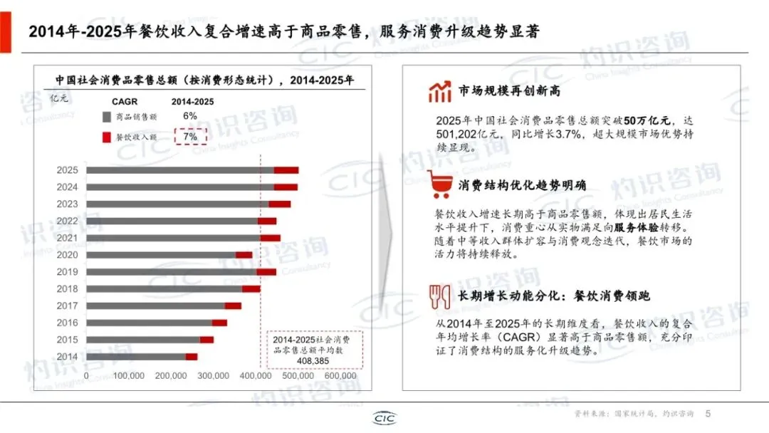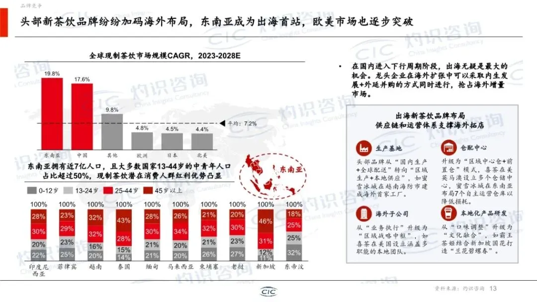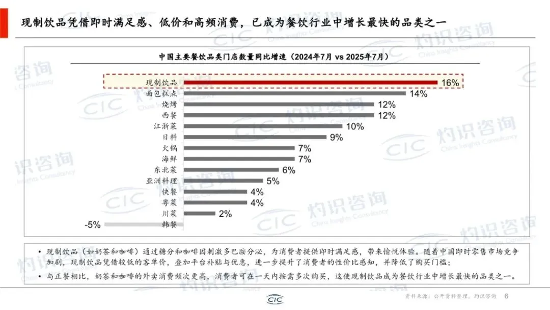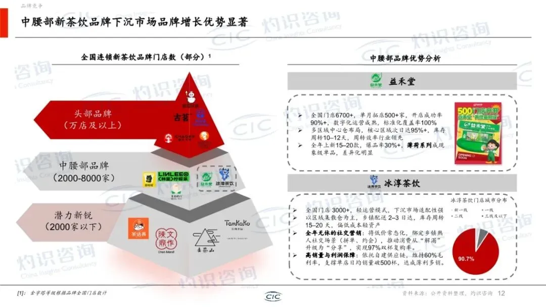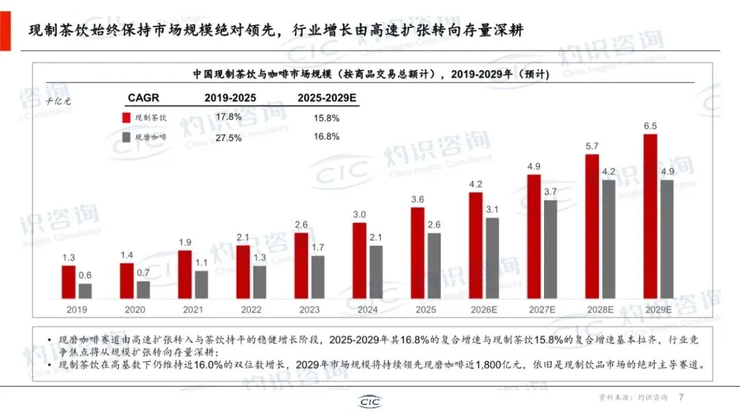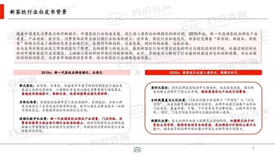 这份由CIC灼识咨询与中国新茶饮产业联盟联合发布,该白皮书是一份系统全面、数据详实、兼具行业全景扫描与深度趋势洞察的权威性年度报告。它不仅梳理了新茶饮行业的发展历程与当前格局,更从宏观环境、市场规模、竞争态势、产品创新、资本动向及产业融合等多个维度,构建了理解该行业的完整分析框架,并明确了未来的核心破局方向。本报告的核心价值在于其 “行业体检”与“战略导航”的双重属性。它并非提出单一理论,而是对已进入“质价比与规模化”新阶段的新茶饮行业,进行了一次全面的“数据化盘点”和“结构化诊断”。报告为行业参与者(品牌方、投资者、供应链企业、研究者)提供了以下关键价值:1. 全景扫描:清晰勾勒了从上游原材料到终端消费,乃至周边延伸市场的完整产业链与市场空间。2. 数据锚定:提供了大量关于市场规模、门店变化、资本表现的历史数据与未来预测(至2029年),使趋势判断有据可依。3. 范式提炼:总结了行业发展的核心范式(如“三二一产业逆向融合”),揭示了成功品牌的内在逻辑。4. 趋势预判:明确指出从“拼规模”到“拼效率”的竞争转向,以及产品、出海、资本关注点的核心变化。报告遵循“背景-现状-趋势-总结”的逻辑,结构清晰,以下分模块解读:报告指出,在GDP增速放缓的背景下,消费结构向服务体验升级的趋势明确。2014-2025年,餐饮收入增速持续高于商品零售,而现制饮品(茶饮、咖啡)凭借其“即时满足、低价高频”的特性,成为餐饮中增长最快的品类。这为新茶饮的持续扩张提供了坚实的底层需求逻辑。第二部分:行业概览——市场空间巨大,竞争进入深水区这是报告最核心的部分之一,系统回答了“行业有多大、钱在哪、谁在赢”的问题。1. 三层市场空间:报告创造性提出了新茶饮公司可触达的“三层市场空间”模型: ◦ 核心层(现制茶饮):2029年预计约6500亿元,是当前主战场。 ◦ 延伸层(零售茶饮):包括茶叶、包装茶饮等,2029年预计约7000亿元,是产品零售化、场景延伸的关键。 ◦ 生态层(周边及生活零售):依托IP和品牌力,拓展至泛生活消费,2029年预计达5万亿元,想象空间巨大。这“三层模型”为品牌增长打开了新视野。 ◦ 战场下沉:一二线市场趋近饱和,下沉市场(三线及以下)仍是拓店核心战场,但开闭店分化加剧,行业从“全民开店”进入“优胜劣汰”阶段。 ▪ 头部品牌:如蜜雪冰城、古茗,凭借极致的供应链效率和加盟体系,实现规模与盈利的平衡,并加码海外布局(东南亚为首站,模式从出口转向本地化生产运营)。 ▪ 中腰部品牌:如益禾堂、冰淳茶饮,凭借在下沉市场的精细化运营、高性价比和强社交属性(如拼单),展现出显著的增速和开店成功率优势。 ◦ 报告指出,新茶饮的产业融合是独特的 “三二一产业逆向融合” 。即以终端消费(三产)和数据为驱动,反向整合中游加工(二产)和上游农业(一产),实现“从杯子到种子”的精准掌控。蜜雪冰城(自建生产基地、智慧农业)和古茗(深度直采、制定企业标准)是典型案例。这已成为头部品牌构建成本、品质和稳定性的核心壁垒。第三部分:产品趋势——健康、风味与情感价值驱动创新产品创新已从早期“食材堆砌”进入“精准创新”阶段,三大趋势主导:1. 地域食材差异化:挖掘木姜子、栀子花等地方性食材,结合特色工艺,打造难以复制的味觉记忆点,打破同质化。2. 功能需求精准化:从“好喝”升级到“喝好”,针对纤体去火、调养气血、肠道健康等具体痛点,添加功能性原料,满足“精准养生”需求。3. 营销策略升级(IP多元化):IP联名从动漫影视扩展至文博、非遗、文旅等更广领域,通过“饮品+周边+体验”的完整体系,将短期流量沉淀为长期品牌资产。4. 经典品类焕新:报告以“泰奶”为例,梳理了通过风味重塑、健康升级、社交货币化、形态创新四步走,让传统品类重新流行的路径,为港奶、抹茶奶茶等提供了可复用的创新模板。第四部分:资本观点——估值逻辑从“规模”转向“效率”1. 市场表现:2025年新茶饮板块在二级市场表现强劲(+49%),一级市场融资在2026年初显现回暖迹象。港股成为主流上市地。2. 投资焦点转移:投资人从过去“押注赛道增长”转向精挑细选个体公司,关注点高度集中于: ◦ 运营能力:同店增长、加盟商盈利模型与复投率、闭店率、数字化投入产出比。 ◦ 供应链能力:原材料自控比例、库存周转、履约成本、抗成本波动能力。 ◦ 产品创新能力:爆品生命周期、汰换率、上新效率与仿制门槛。3. 未来趋势:资本将更青睐能证明运营效率、供应链韧性及可持续产品力的品牌。行业并购整合加速,用于品类扩张与供应链补强。报告在总结中提炼了五大破局关键,构成了对新茶饮企业的核心战略建议:1. 市场空间:依托政策、供应链提效、AI赋能、渠道下沉,行业宏观前景依然广阔。2. 品牌突围:头部品牌靠出海(文化融合+供应链输出),中腰部品牌靠下沉市场精细化运营。3. 产品创新:坚守健康化、风味独特化、IP情感化三大主旋律,并挖掘经典品类焕新机会。4. 资本逻辑:赢得资本认可的关键从“开店速度”变为运营效率与盈利质量。5. 产业协同:深化 “三二一产业逆向融合” ,通过“政产学研企”协作,掌控全产业链,实现“四流合一”。这是一份质量极高、具有重要参考价值的行业标准式研究报告。其突出优点在于:• 
