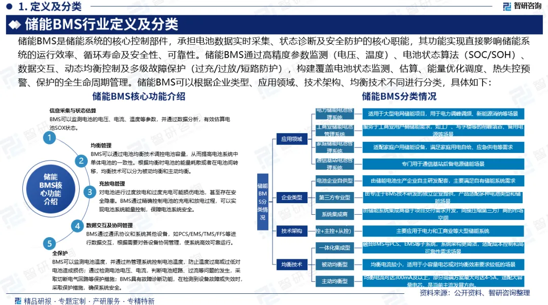 行业定义及功能:储能BMS是储能系统的核心控制部件,承担电池数据实时采集、状态诊断及安全防护的核心职能,其功能实现直接影响储能系统的运行效率、循环寿命及安全性、可靠性。储能BMS通过高精度参数监测、电池状态算法、数据交互、动态均衡控制及多级故障保护,构建覆盖电池状态监测、估算、能量优化调度、热失控预警、保护的全生命周期管理。