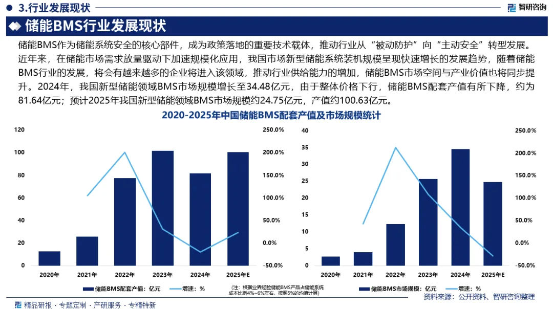 中国市场规模:近年来,在储能市场需求放量驱动下加速规模化应用,我国市场新型储能系统装机规模呈现快速增长的发展趋势,储能BMS市场空间与产业价值也将同步提升。2024年,我国新型储能领域BMS市场规模从2020年的2.75亿元增长至34.48亿元,预计2025年由于价格与利润挤压,我国新型储能领域BMS市场规模约24.75亿元。