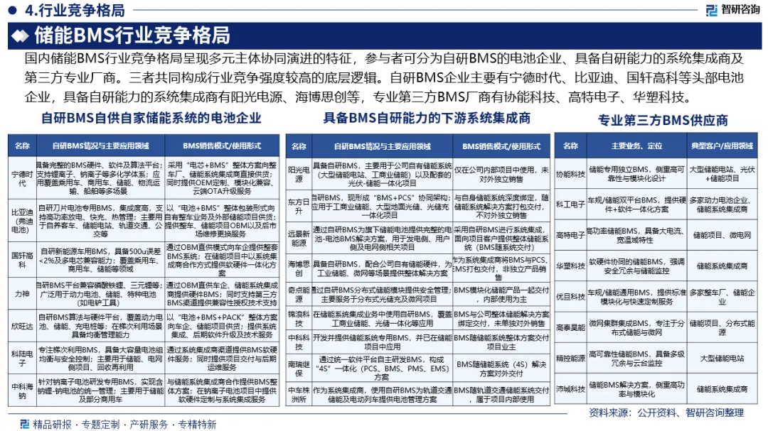 竞争情况:国内储能BMS行业竞争格局呈现多元主体协同演进的特征,参与者可分为自研BMS的电池企业、具备自研能力的系统集成商及第三方专业厂商。三者共同构成行业竞争强度较高的底层逻辑。自研BMS企业主要有宁德时代、比亚迪、国轩高科等头部电池企业,具备自研能力的系统集成商有阳光电源、海博思创等,专业第三方BMS厂商有协能科技、高特电子、华塑科技。