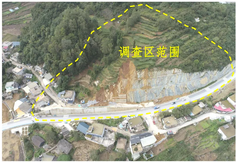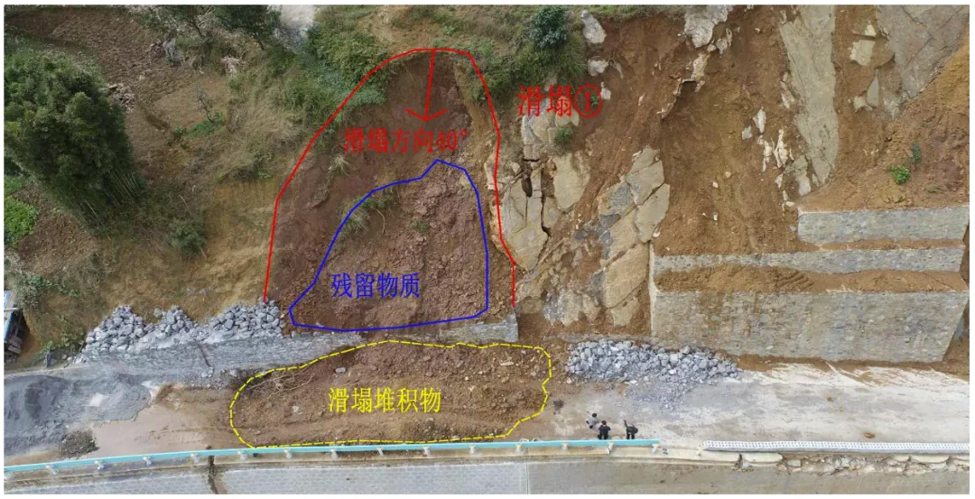 事故现场位于切方边坡南东部,滑塌方向40°,坡度55°~60°,横向宽约6m,高约10m,出露地层为三叠系下统飞仙关组第二段(T1f2)暗紫、紫红色薄至中厚层状强风化泥质粉砂岩,滑塌区域下部(浆砌石挡墙上方)残留部分碎石土,方量约12m³。大部分滑塌物质堆积于下方混凝土道路,堆积物长约8m,宽约4m,厚度0.2m~1m,方量约26m³,主要为粘土、强风化粉砂质泥岩(见图3)。