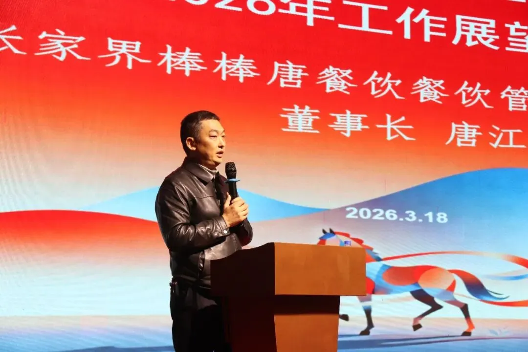 紧接着,张家界餐饮界颇具传奇色彩的实干家、张家界棒棒唐餐饮餐饮管理有限公司董事长唐江带来了他对品牌升级的思考。刚刚在2025年底推出新品牌“喜棠家饭”的唐江,分享了他从“索溪山寨”到“大队老渔村”,再到“喜棠家饭”的品牌迭代逻辑。他表示,未来的餐饮竞争不仅是产品的竞争,更是文化空间的竞争,要致力于将张家界土家饮食文化从景区游客市场向“游客+市民”双轨市场深度拓展,让餐厅成为能让人静下心来感受地方人情味的“城市客厅” 。