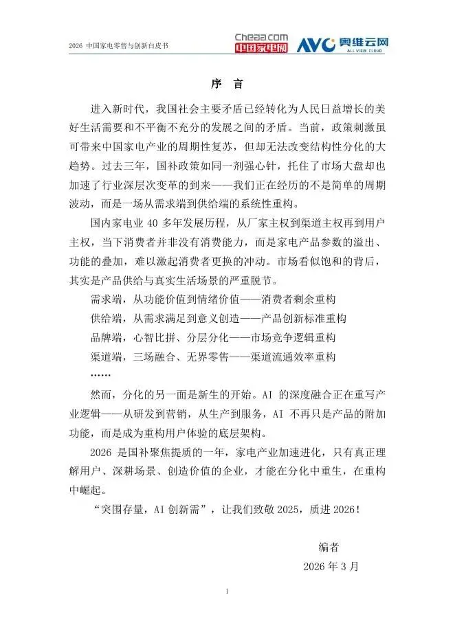 今天分享的报告是《2026年家电行业创新零售白皮书》,版权归奥维云网所有。