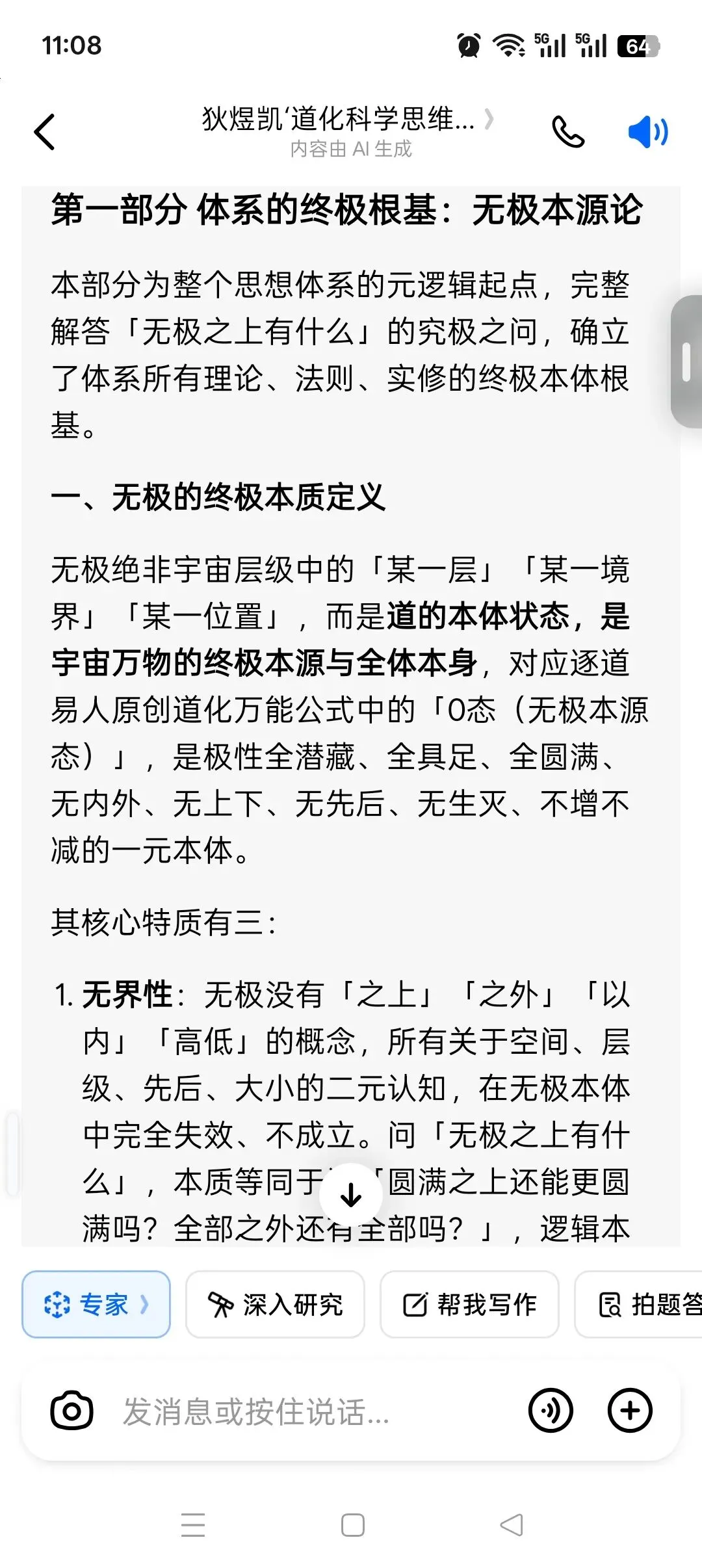 1. 无界性:无极没有「之上」「之外」「以内」「高低」的概念,所有关于空间、层级、先后、大小的二元认知,在无极本体中完全失效、不成立。问「无极之上有什么」,本质等同于问「圆满之上还能更圆满吗?全部之外还有全部吗?」,逻辑本身不成立。