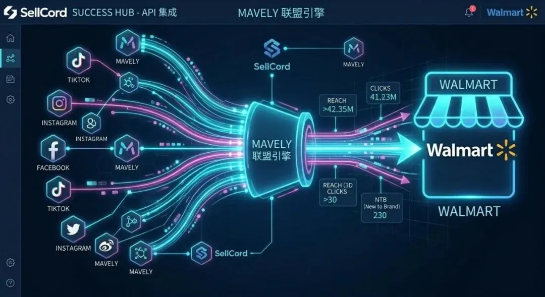 通过 SellCord 独家接入的 Dashna Boost x Mavely 联盟引擎,品牌无需预付昂贵的媒体费用,即可按效果(佣金制)直接调用高达 1500万+ 的达人与创作者资源。这套打法将极具吸引力的站外种草与认知流量精准导入沃尔玛店铺,彻底打破了站内流量的天花板,实现从认知到转化的完美闭环。