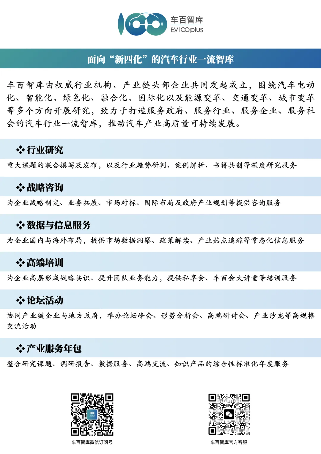 这31期报告,凝聚了车百智库研究团队的集体智慧,也离不开有关部门、行业同仁、企业伙伴等的鼎力支持。我们力求通过严谨的研究和深刻的洞察,为行业的高质量、可持续发展贡献一份力量。我们诚挚欢迎对新能源汽车产业感兴趣的各界朋友与我们联系,深入了解报告内容,探讨合作机会,共同推动产业的进步与繁荣。
