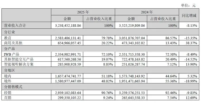 2025 年,受全球市场需求波动、教育行业存量主导等因素影响,公司核心教育板块实现收入 25.83 亿元,占营业收入比重 79.78%,同比下降 15.35%,但仍为公司营收基石。值得关注的是,商用及其他领域表现亮眼,实现收入 6.55 亿元,占比 20.22%,同比大幅增长 38.37%,成为拉动公司增长的关键动力。