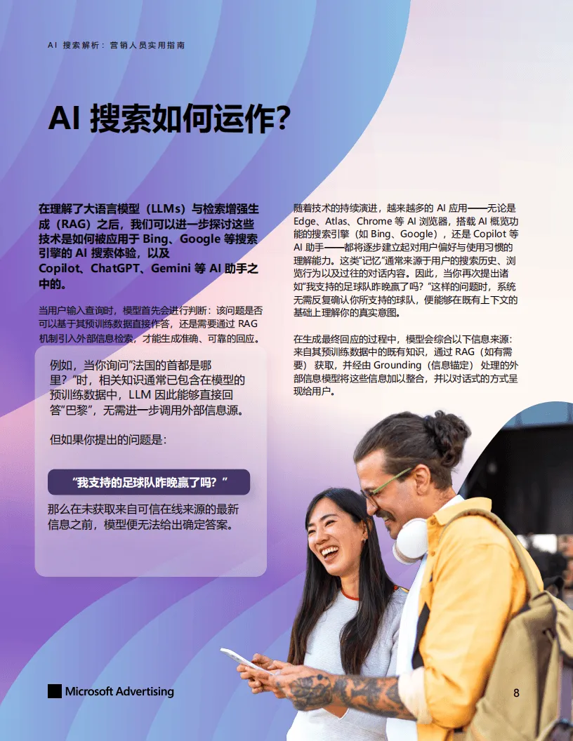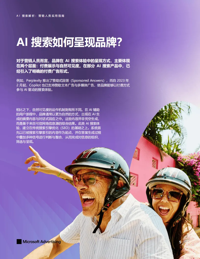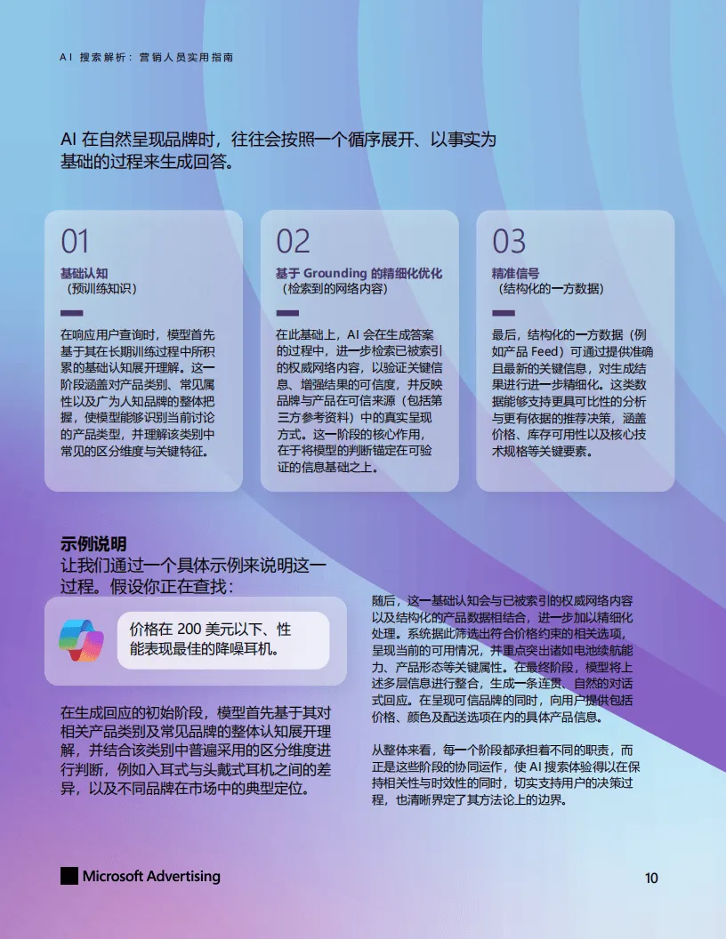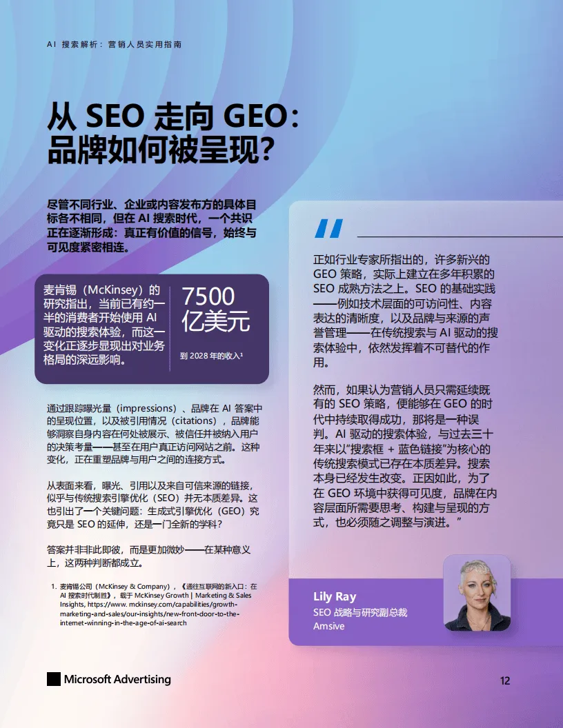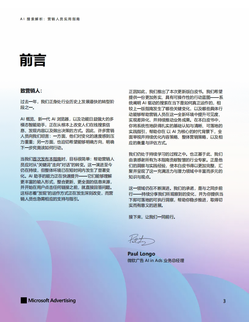 这份微软2026年AI搜索解析营销指南,聚焦AI驱动下搜索从“关键词”向“对话式”转型的行业趋势,为营销人员提供了兼具理论与实操的行动蓝图,核心围绕AI搜索的运作逻辑、品牌呈现方式及适配的营销战略展开,旨在帮助品牌在AI时代提升搜索可见度、实现商业价值。