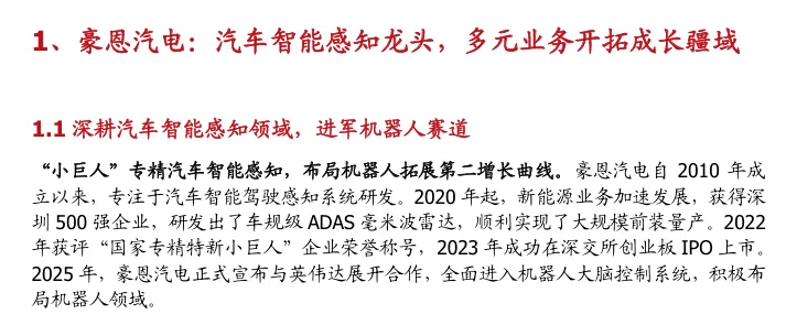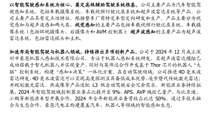 摘要:本报告系统讲解了豪恩汽电的核心业务、技术布局与增长潜力,让行业从业者与投资者深入了解其作为智能驾驶感知龙头的核心价值。公司深耕车载摄像、超声波雷达等产品,2025H1超声波雷达本土市占率27%居首,手握209亿定点订单。通过与英伟达合作布局机器人域控,形成“智驾+机器人”双轮驱动,新增长曲线清晰,为把握智能化与场景拓展红利提供清晰指引。