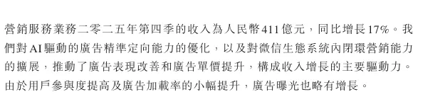社交网络板块也受益于视频号直播、音乐付费会员增长和AI工具接入,收入稳步提升,微信生态的内容变现能力进一步释放。