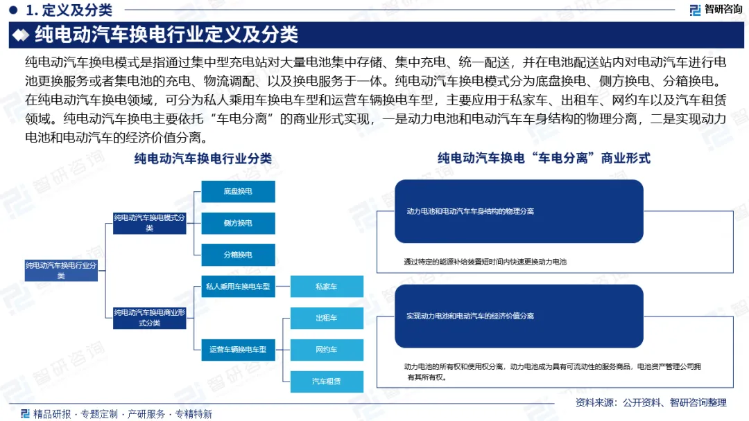 行业定义及分类:纯电动汽车换电模式是指通过集中型充电站对大量电池集中存储、集中充电、统一配送,并在电池配送站内对电动汽车进行电池更换服务或者集电池的充电、物流调配、以及换电服务于一体。纯电动汽车换电模式分为底盘换电、侧方换电、分箱换电。在纯电动汽车换电领域,可分为私人乘用车换电车型和运营车辆换电车型,主要应用于私家车、出租车、网约车以及汽车租赁领域。