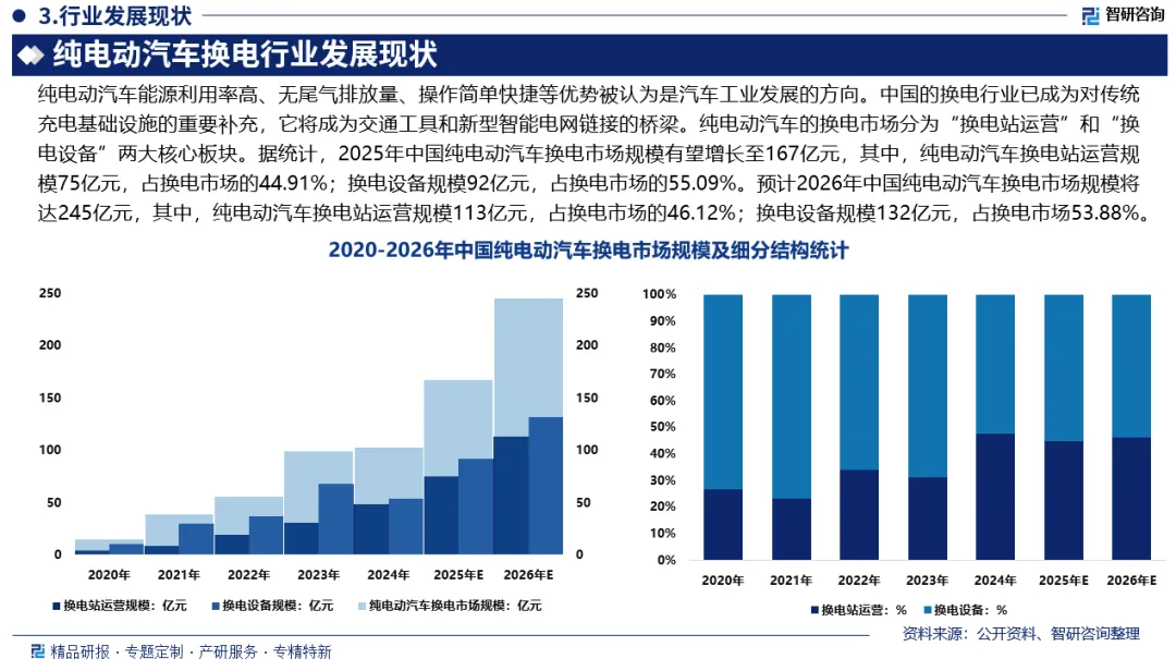 纯电动汽车换电行业已成为对中国传统充电基础设施的重要补充,它将成为交通工具和新型智能电网链接的桥梁。纯电动汽车的换电市场分为“换电站运营”和“换电设备”两大核心板块。据统计,2025年中国纯电动汽车换电市场规模有望增长至167亿元,其中,纯电动汽车换电站运营规模75亿元,占换电市场的44.91%;换电设备规模92亿元,占换电市场的55.09%。预计2026年中国纯电动汽车换电市场规模将达245亿元,其中,纯电动汽车换电站运营规模113亿元,占换电市场的46.12%;换电设备规模132亿元,占换电市场53.88%。