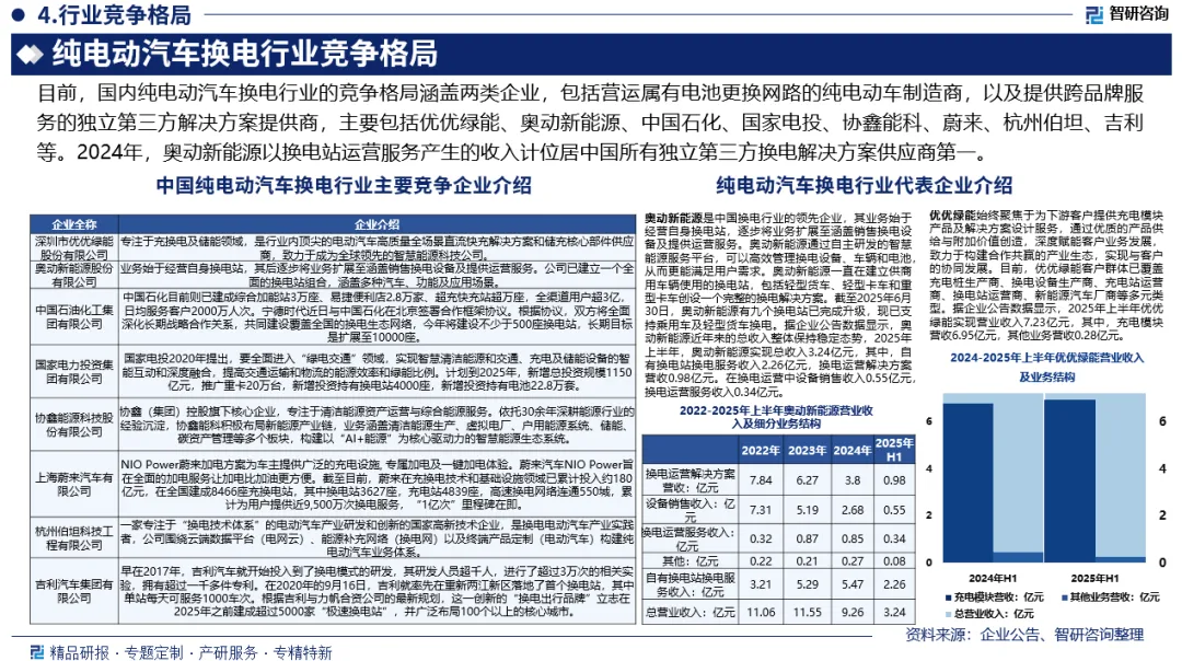 竞争情况:目前,国内纯电动汽车换电行业的竞争格局涵盖两类企业,包括营运属有电池更换网路的纯电动车制造商,以及提供跨品牌服务的独立第三方解决方案提供商,主要包括优优绿能、奥动新能源、中国石化、国家电投、协鑫能科、蔚来、杭州伯坦、吉利等。2024年,奥动新能源以换电站运营服务产生的收入计位居中国所有独立第三方换电解决方案供应商第一。