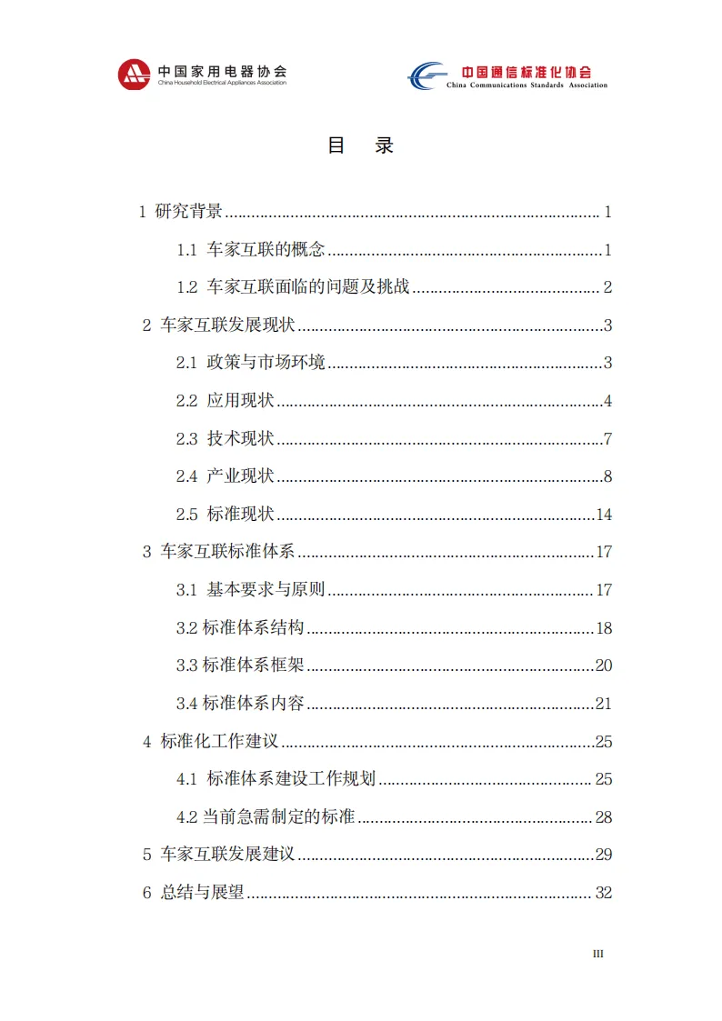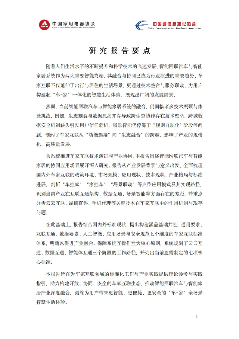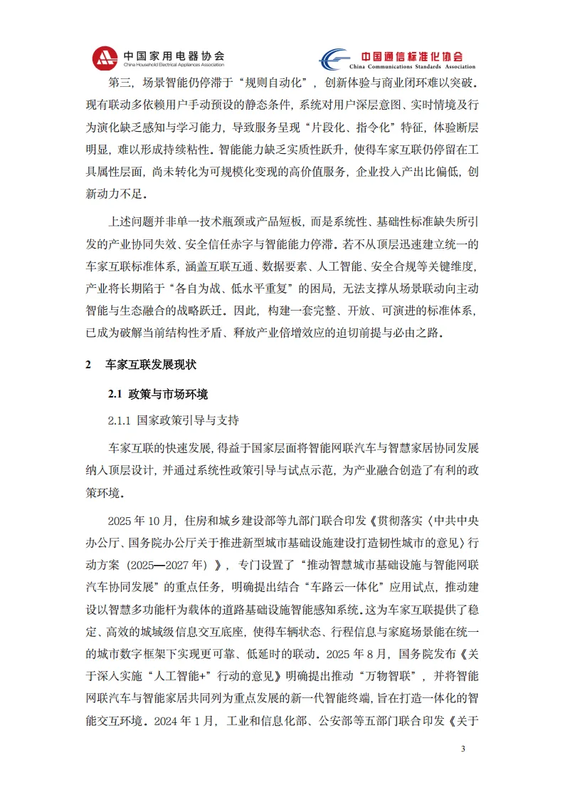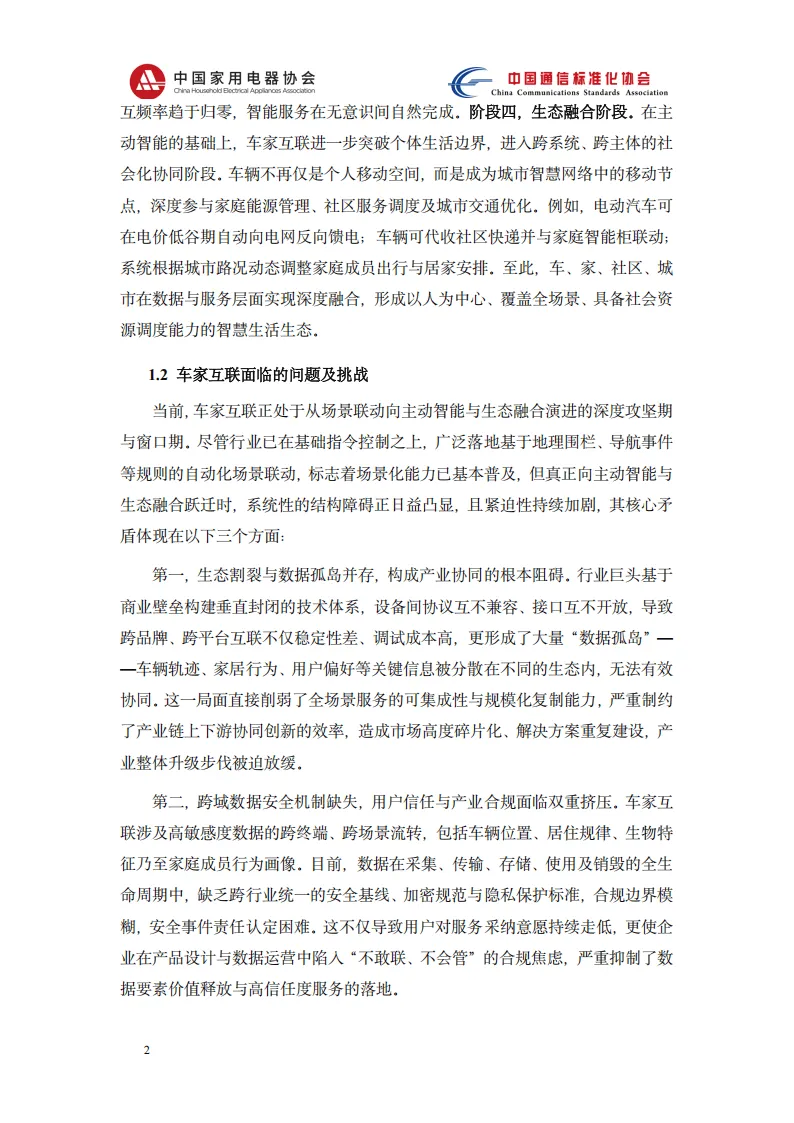 这份由中国家用电器协会与中国通信标准化协会联合发布的报告,聚焦2026年智能网联汽车与智能家居系统协同应用技术,剖析车家互联发展现状、痛点并构建标准体系,为产业融合提供指引。车家互联作为打破出行与居住边界的跨场景生态,其发展分为远程控制、场景联动、主动智能、生态融合四个阶段,当前正处于从场景联动向主动智能演进的关键期,却面临生态割裂、数据安全机制缺失、场景智能停留在规则自动化的核心问题,成为产业规模化发展的阻碍。