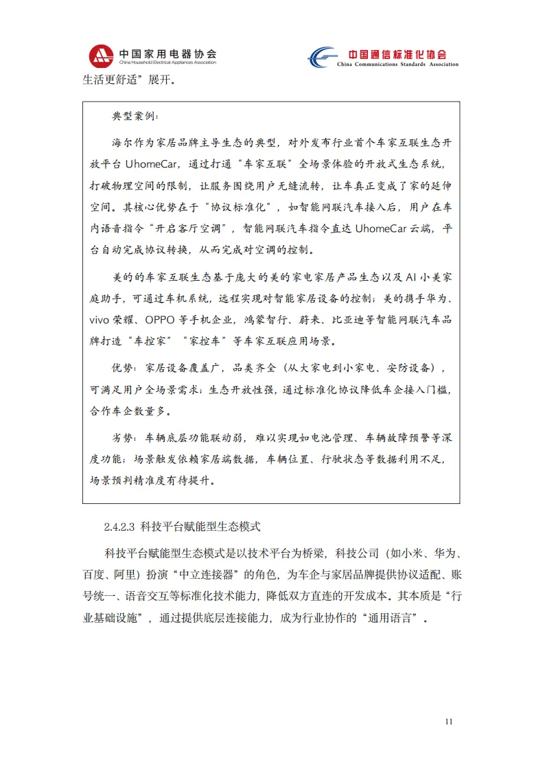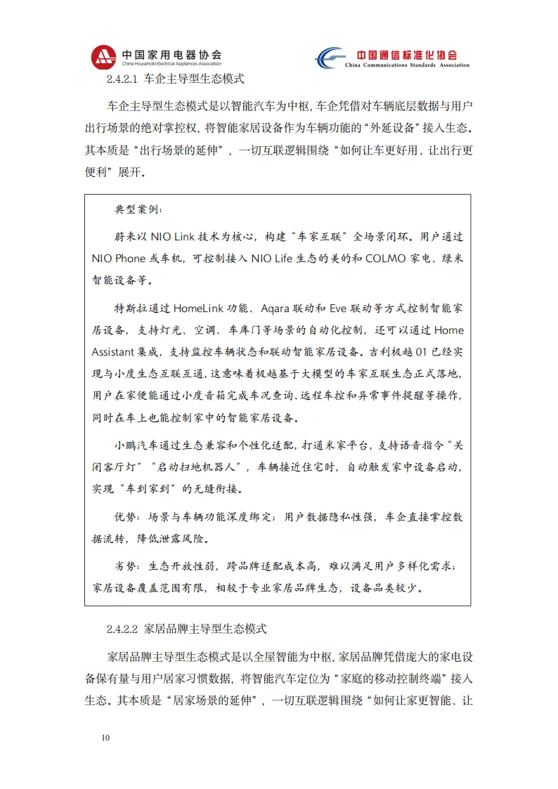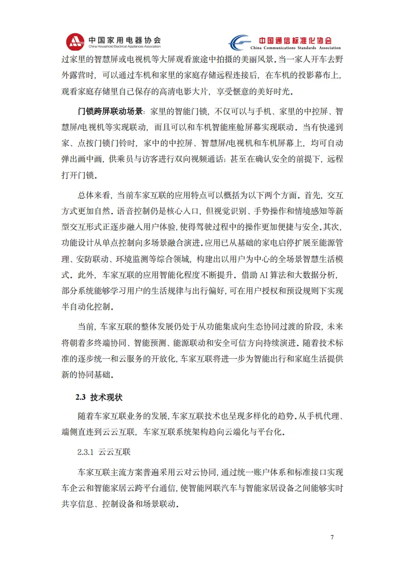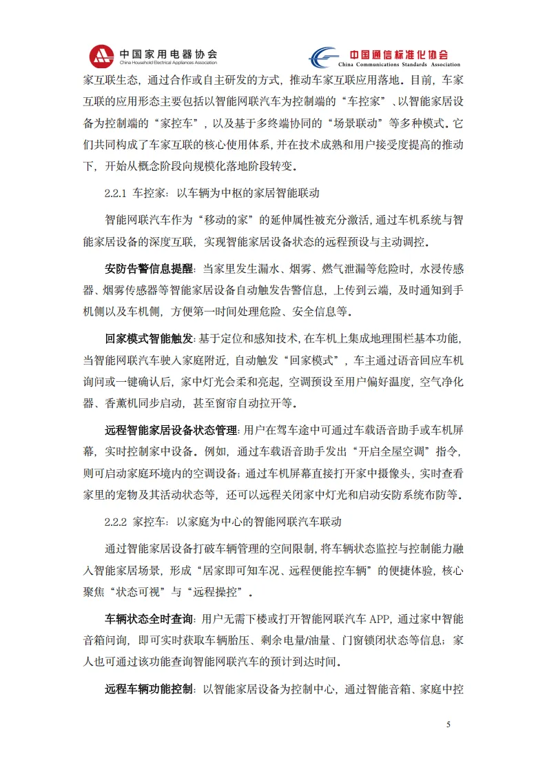 这份由中国家用电器协会与中国通信标准化协会联合发布的报告,聚焦2026年智能网联汽车与智能家居系统协同应用技术,剖析车家互联发展现状、痛点并构建标准体系,为产业融合提供指引。车家互联作为打破出行与居住边界的跨场景生态,其发展分为远程控制、场景联动、主动智能、生态融合四个阶段,当前正处于从场景联动向主动智能演进的关键期,却面临生态割裂、数据安全机制缺失、场景智能停留在规则自动化的核心问题,成为产业规模化发展的阻碍。