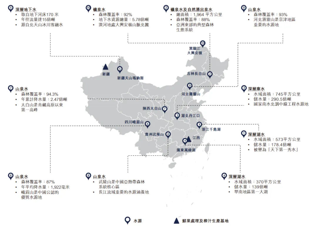 农夫山泉是国内瓶装水企业中水源地布局最早、最广、最优质的品牌,早在上世纪 90 年代,当多数品牌还在依赖城市自来水加工时,农夫山泉就果断摒弃这一模式,将目光锁定在全国范围内的天然山泉、矿泉水源地。