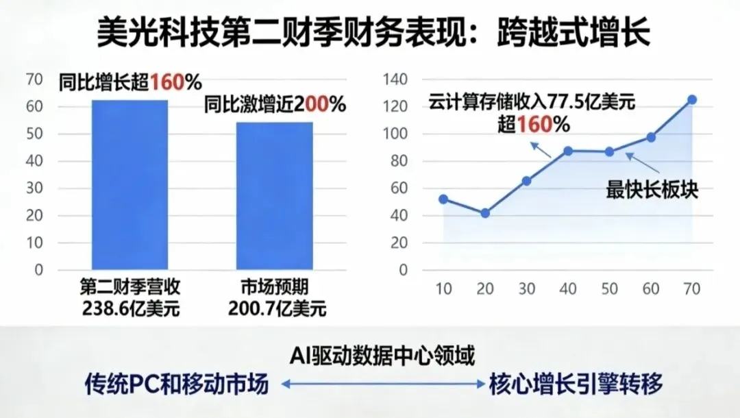 一、 业绩全景:跨越式增长,盈利能力飙升,美光科技本季度的财务表现可以用“跨越式增长”来形容。其核心增长引擎已从传统的PC和移动市场,彻底转向了由AI驱动的数据中心领域。