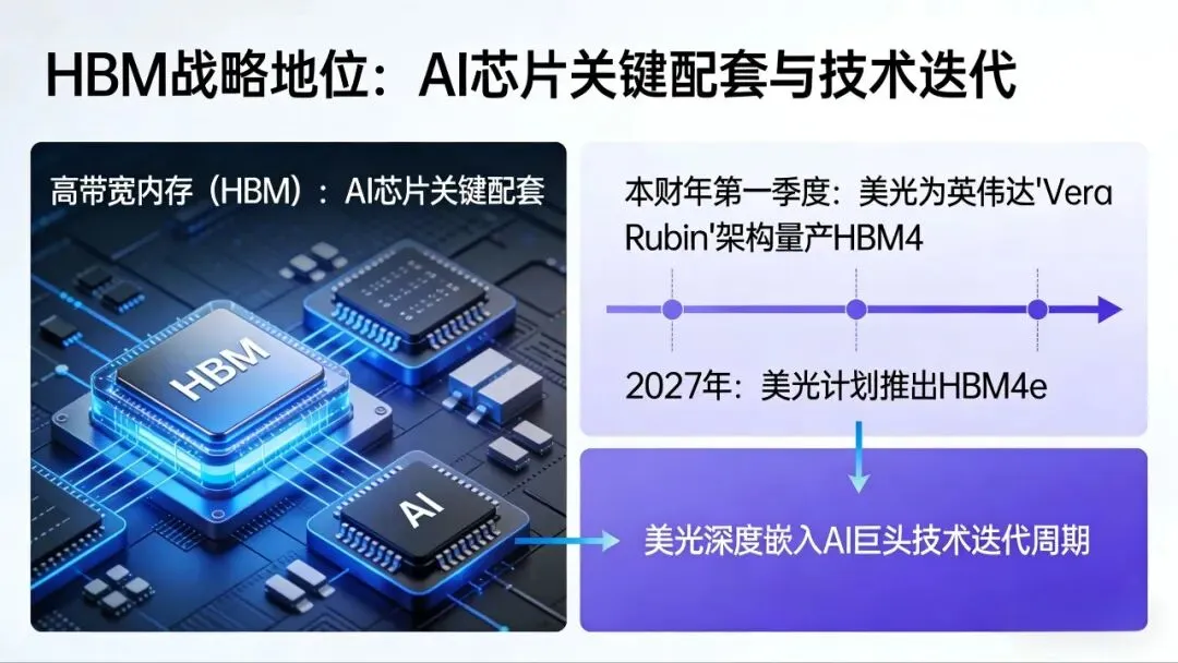 · HBM的战略地位:高带宽内存(HBM)作为AI芯片的关键配套,已成为行业利润最高的产品。美光已在本财年第一季度开始为英伟达下一代“Vera Rubin”架构量产 HBM4,并计划在2027年推出升级版 HBM4e。这标志着美光已深度嵌入AI巨头的技术迭代周期。