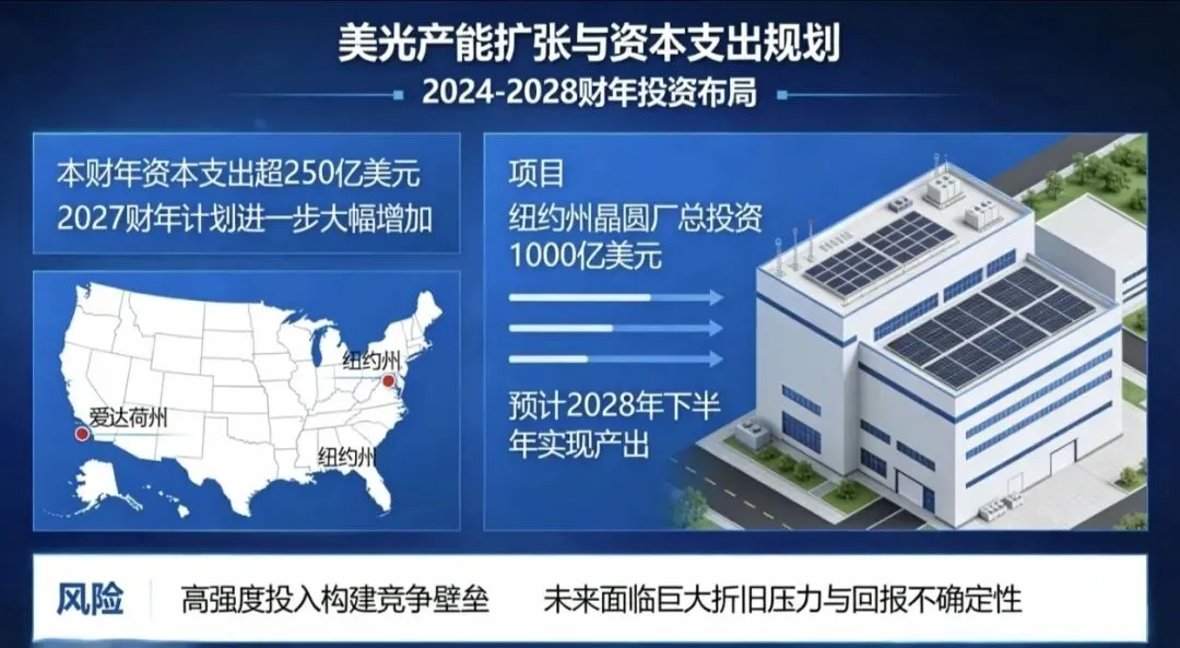· 巨额投资:为应对未来需求,美光正进行大规模产能扩张。本财年资本支出预计超过 250亿美元,并计划到2027财年进一步大幅增加,主要用于美国爱达荷州和纽约州的晶圆厂建设。其中,纽约项目的总投资高达 1000亿美元,预计2028年下半年实现产出。这种高强度投入,既是构建竞争壁垒的必要手段,也意味着未来将面临巨大的折旧压力和回报不确定性。