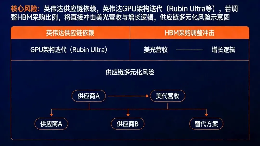 作为AI算力的核心厂商,英伟达在产品迭代中对HBM供应商的选择,将对美光产生决定性影响。目前,市场的不确定性在于:若英伟达在未来的GPU架构中(如后续的Rubin Ultra或更下一代产品)出于供应链多元化或技术路线考虑,调整或减少对美光HBM的采购比例,将对美光的营收和增长故事造成直接冲击。