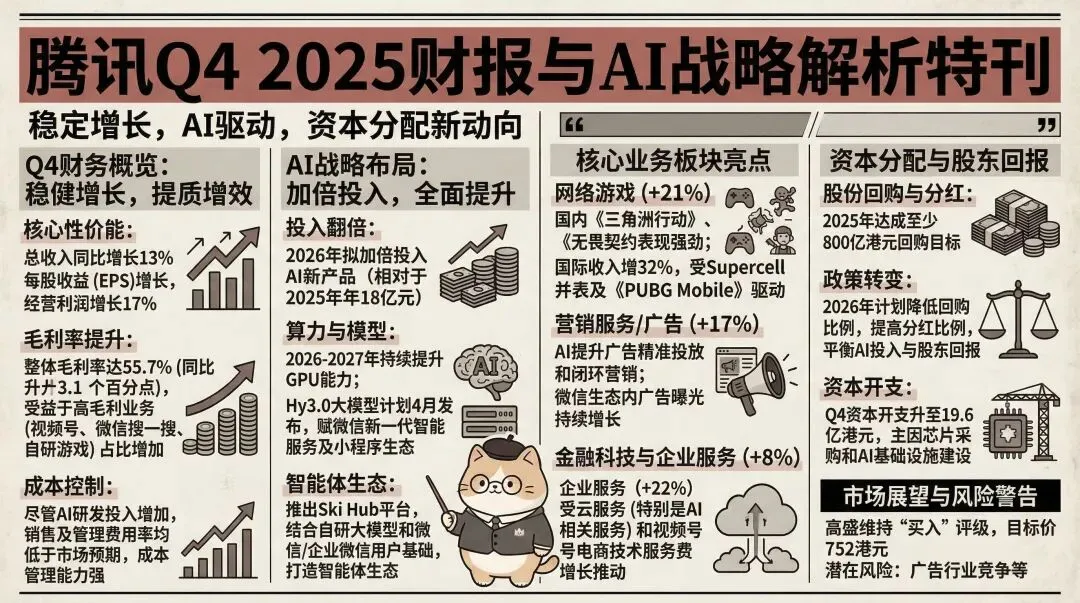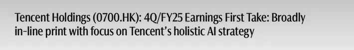 我们预计投资者在业绩电话会上将重点关注腾讯的整体 AI 战略(已公布的投资规模与领域、潜在资本支出、留住顶尖 AI 人才的策略、模型 / 生产力 AI 及微信智能助手的时间线)、游戏 / 广告业务展望,以及增量投资下的利润增长预期。