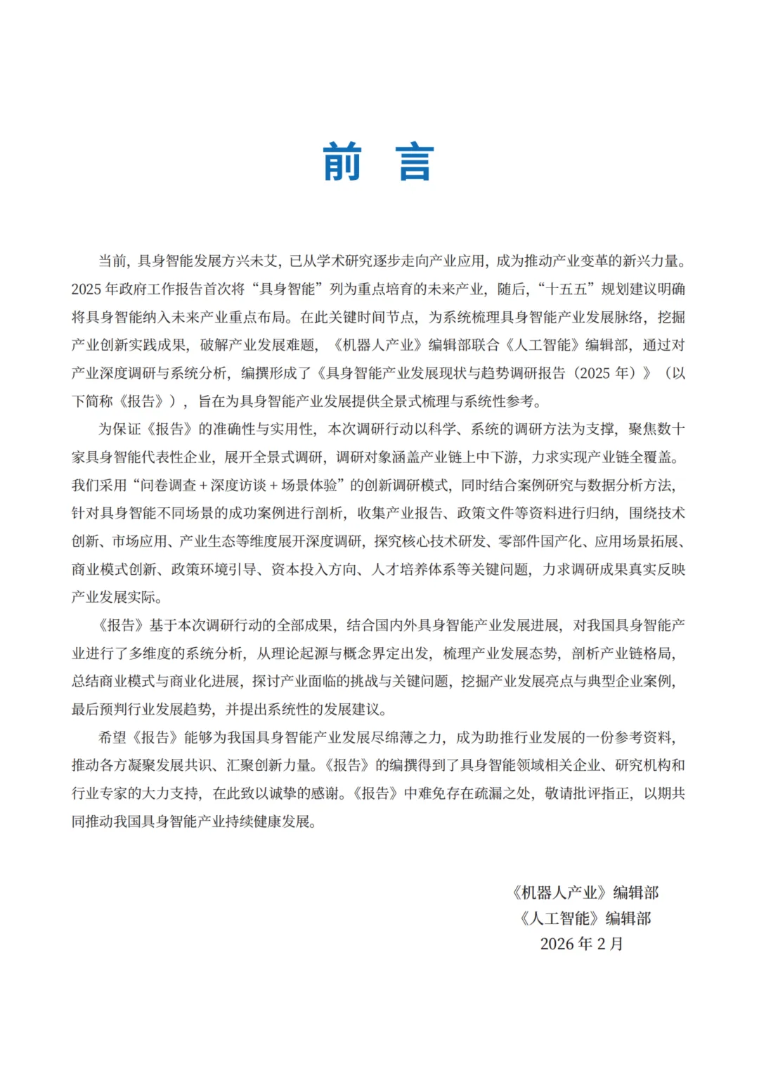 报告简介:当前,具身智能发展方兴未艾,已从学术研究逐步走向产业应用,成为推动产业变革的新兴力量。2025年政府工作报告首次将“具身智能”列为重点培育的未来产业,随后,“十五五”规划建议明确将具身智能纳入未来产业重点布局。在此关键时间节点,为系统梳理具身智能产业发展脉络,挖掘产业创新实践成果,破解产业发展难题,《机器人产业》编辑部联合《人工智能》编辑部,通过对产业深度调研与系统分析,编撰形成了《具身智能产业发展现状与趋势调研报告(2025年)》(以下简称《报告》),旨在为具身智能产业发展提供全景式梳理与系统性参考。