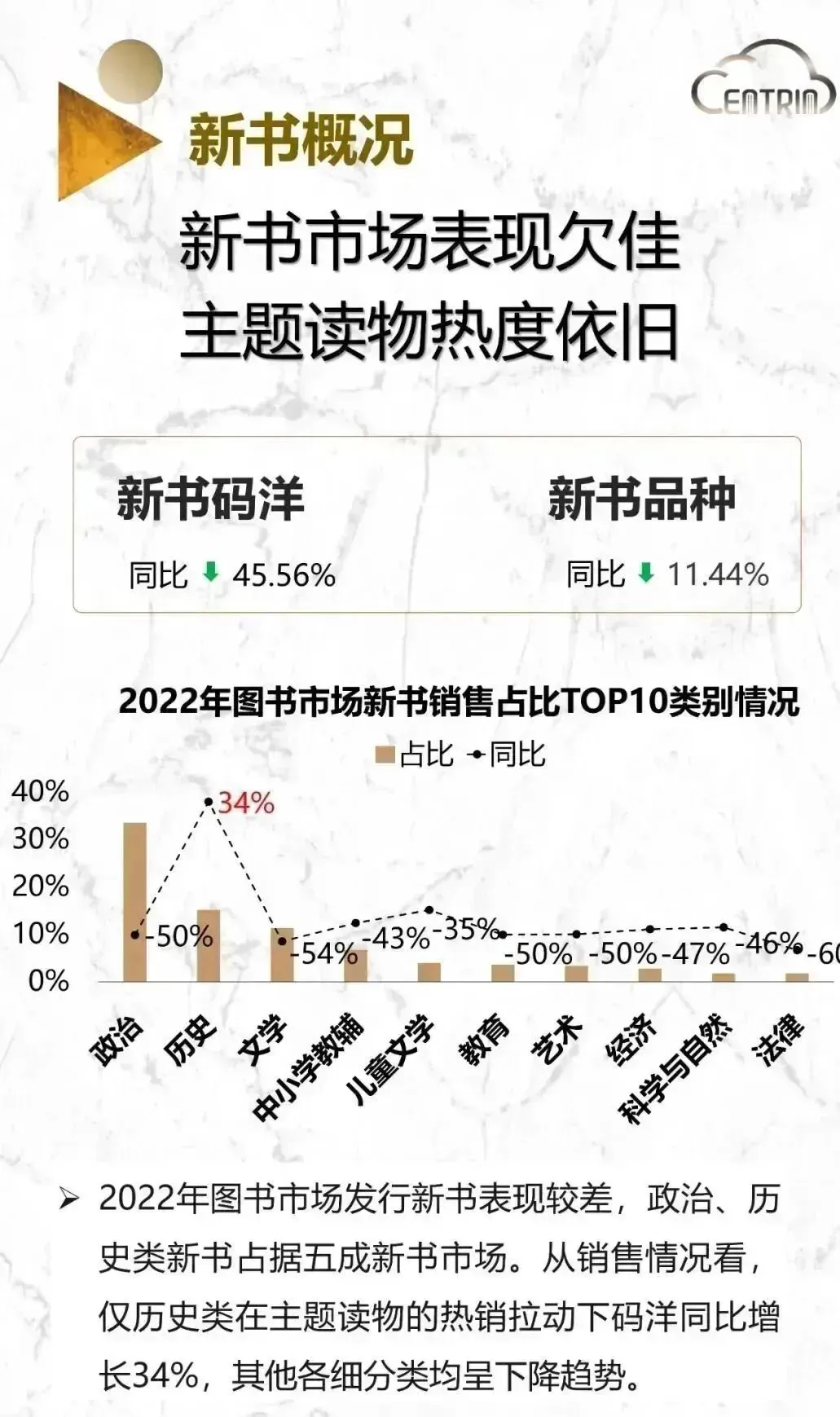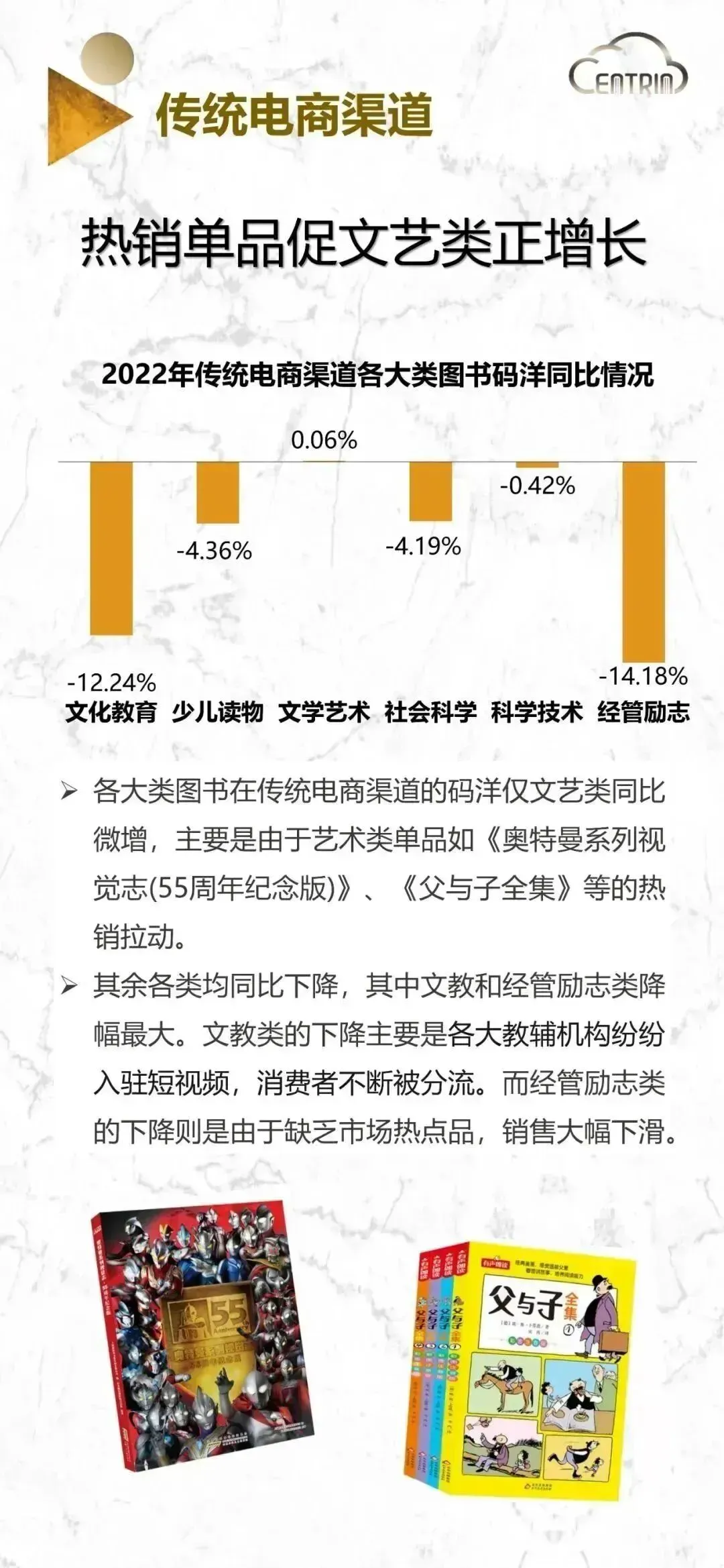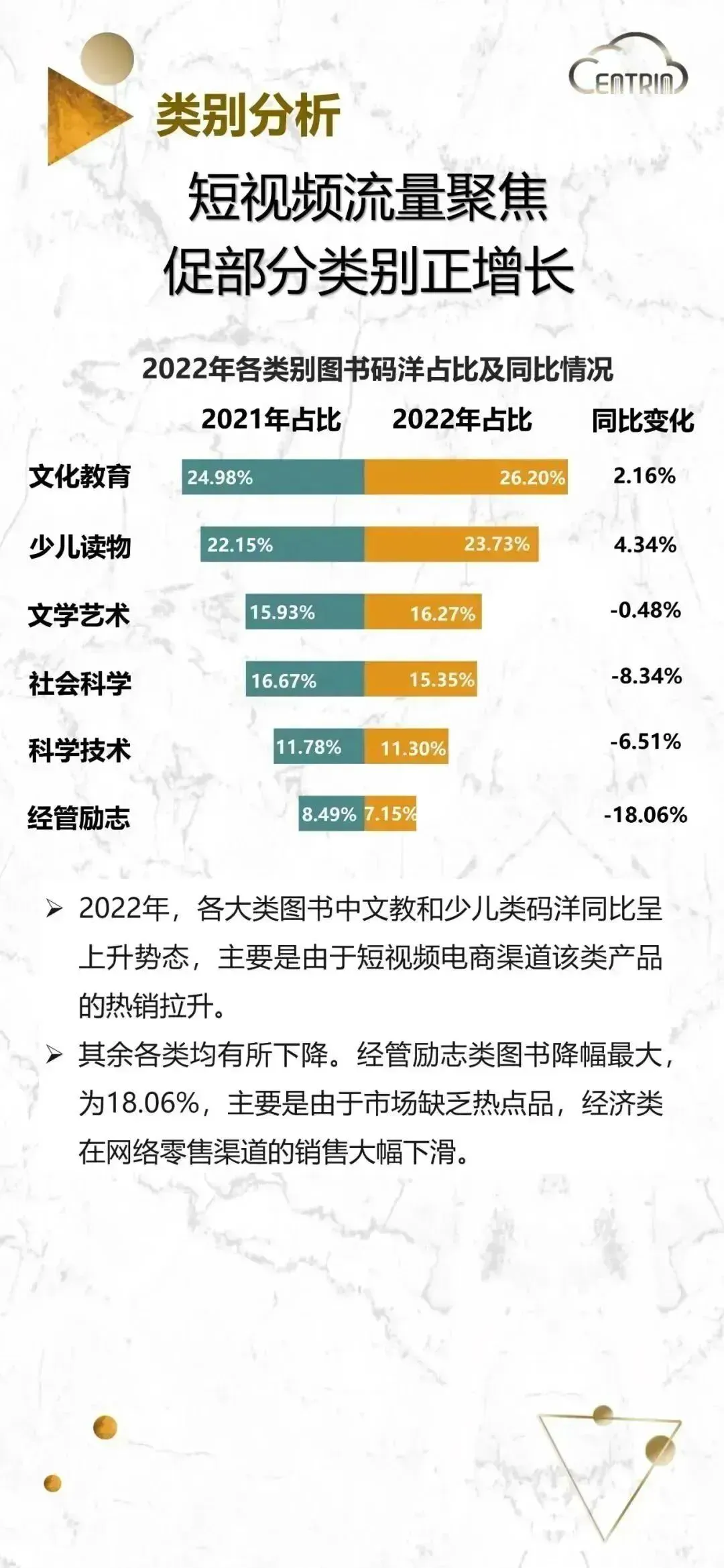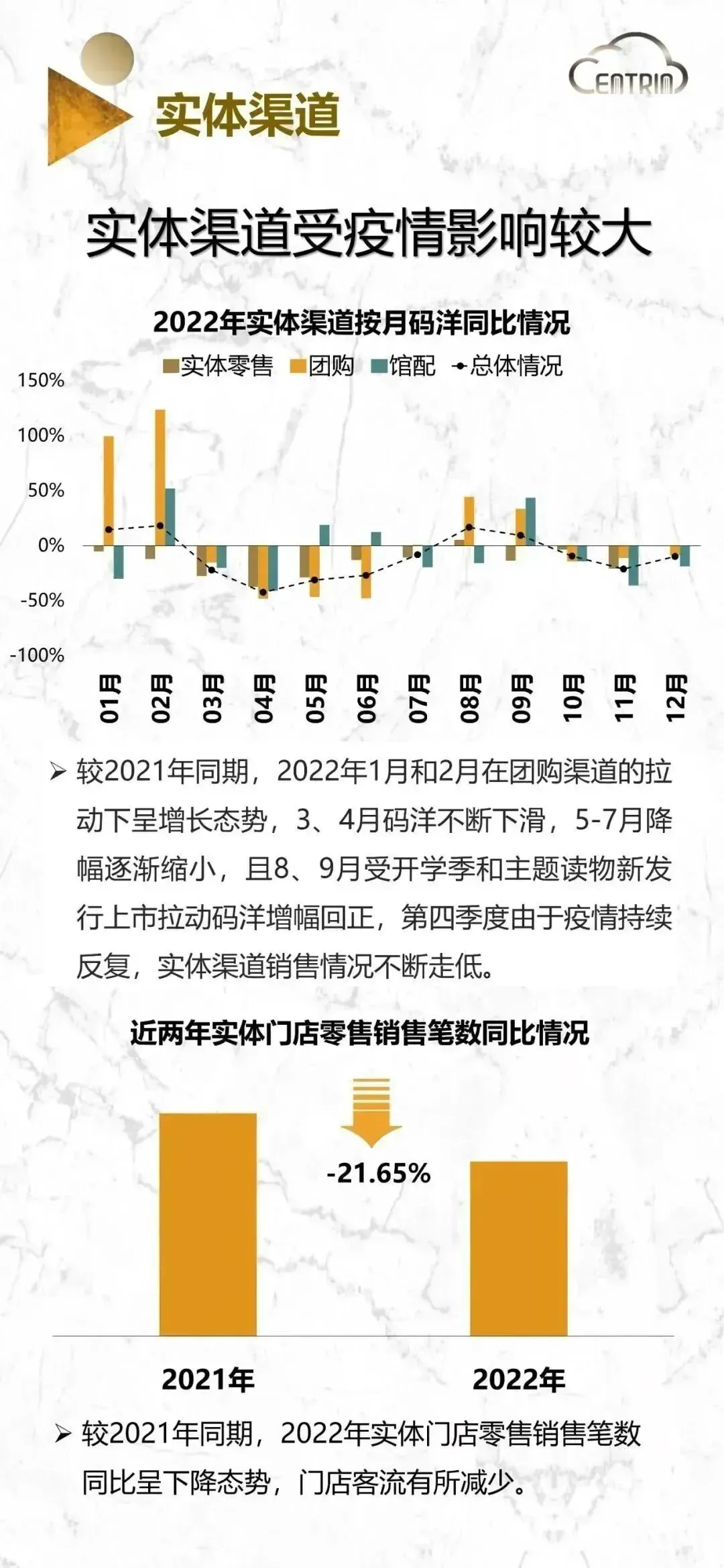 中金易云科技有限责任公司1月3日发布了2022年年度图书市场数据报告。依托其大数据平台监控的8500+实体和网络书店的数据,中金易云对过去一年图书市场的发展和问题进行了深度扫描。报告中涉及到实体渠道、传统电商渠道、短视频电商渠道,与新华文轩的业务息息相关。我们不仅要关注市场,还要善于总结自身,2022新华文轩零售市场表现如何?我们一起来看看!