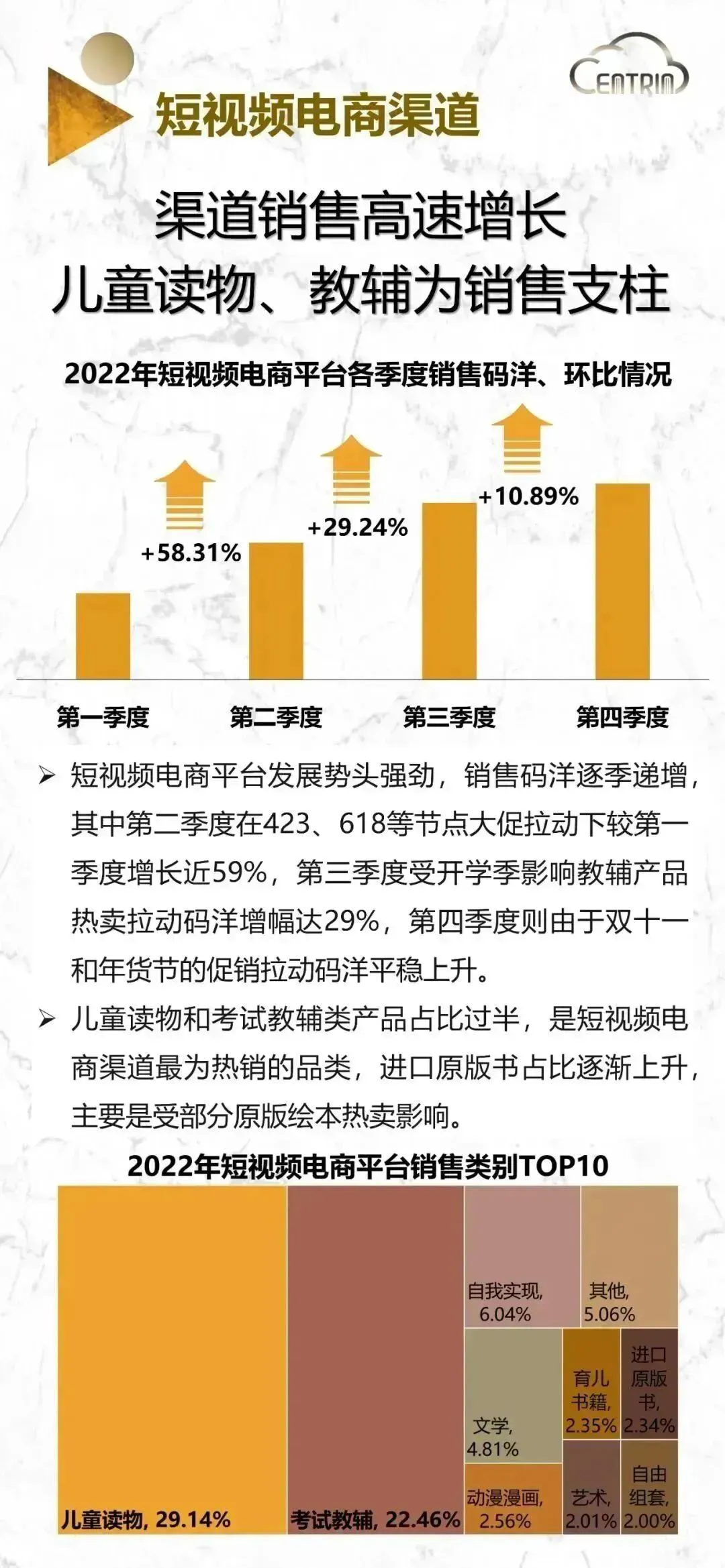 中金易云显示,短视频电商呈持续上升的态势,市场份额达到18%。儿童读物和考试教辅类产品占比过半,是短视频电商渠道最为热销的品类,进口原版书受到原版绘本热卖的影响,占比也在逐渐上升。